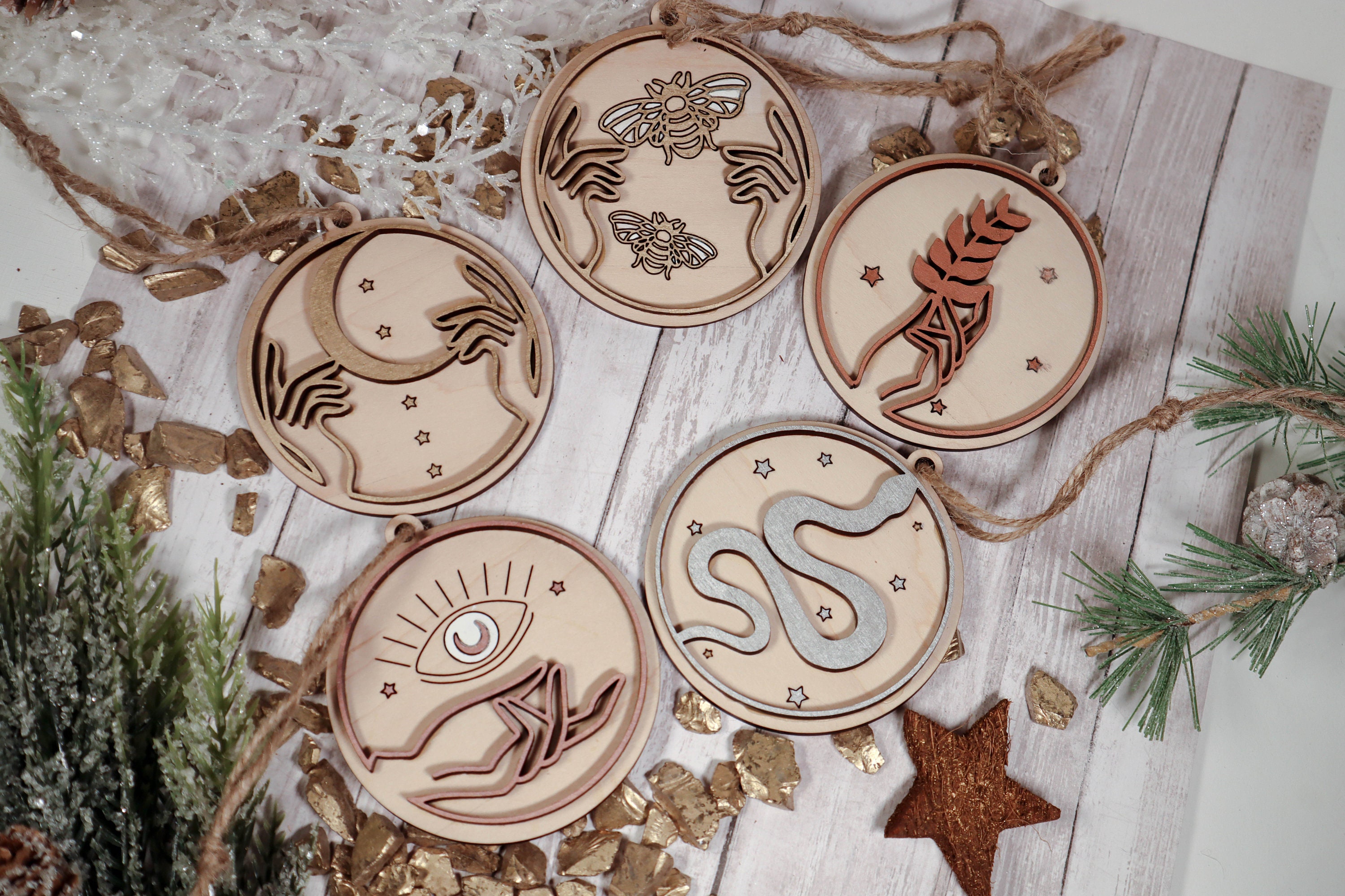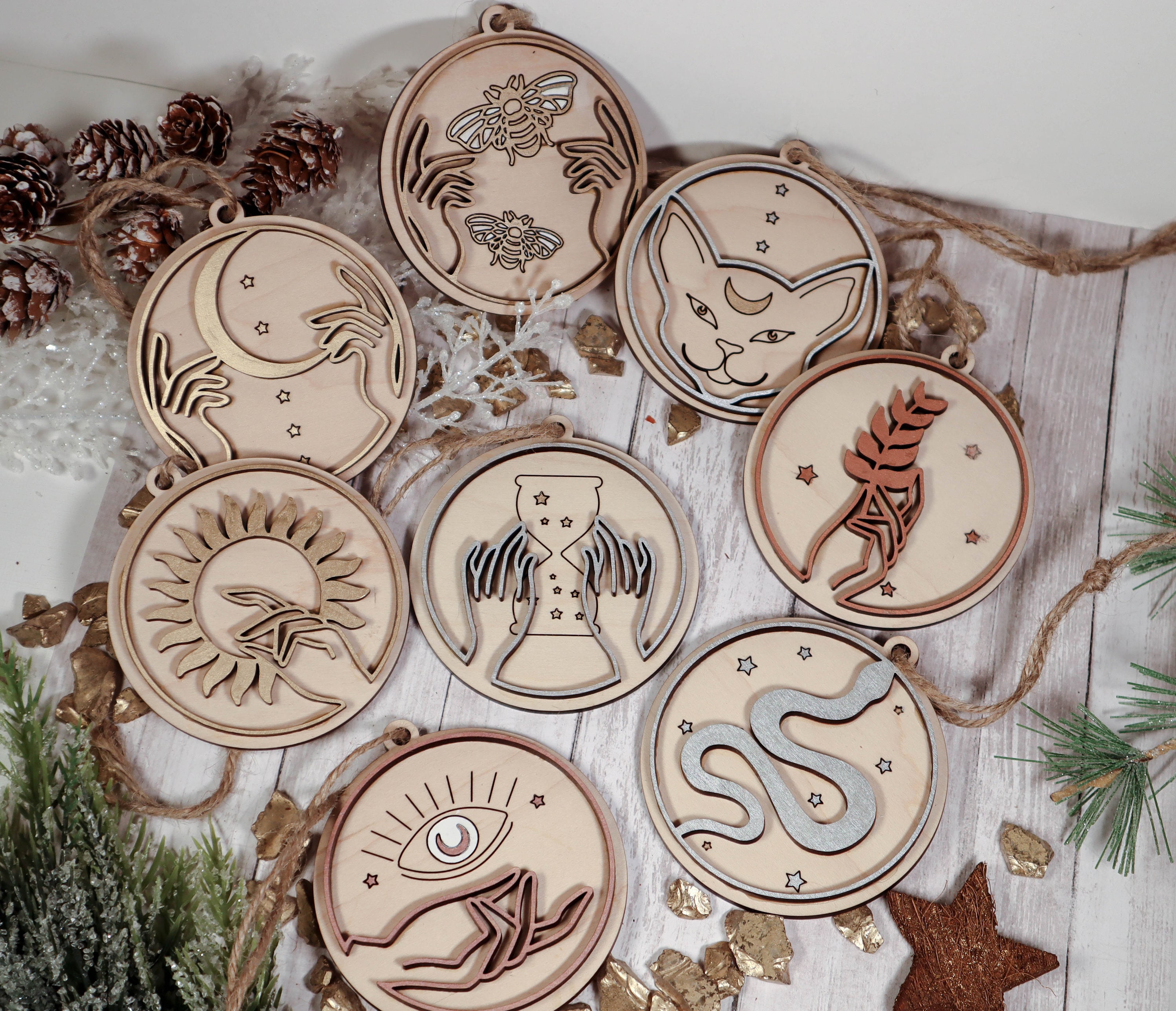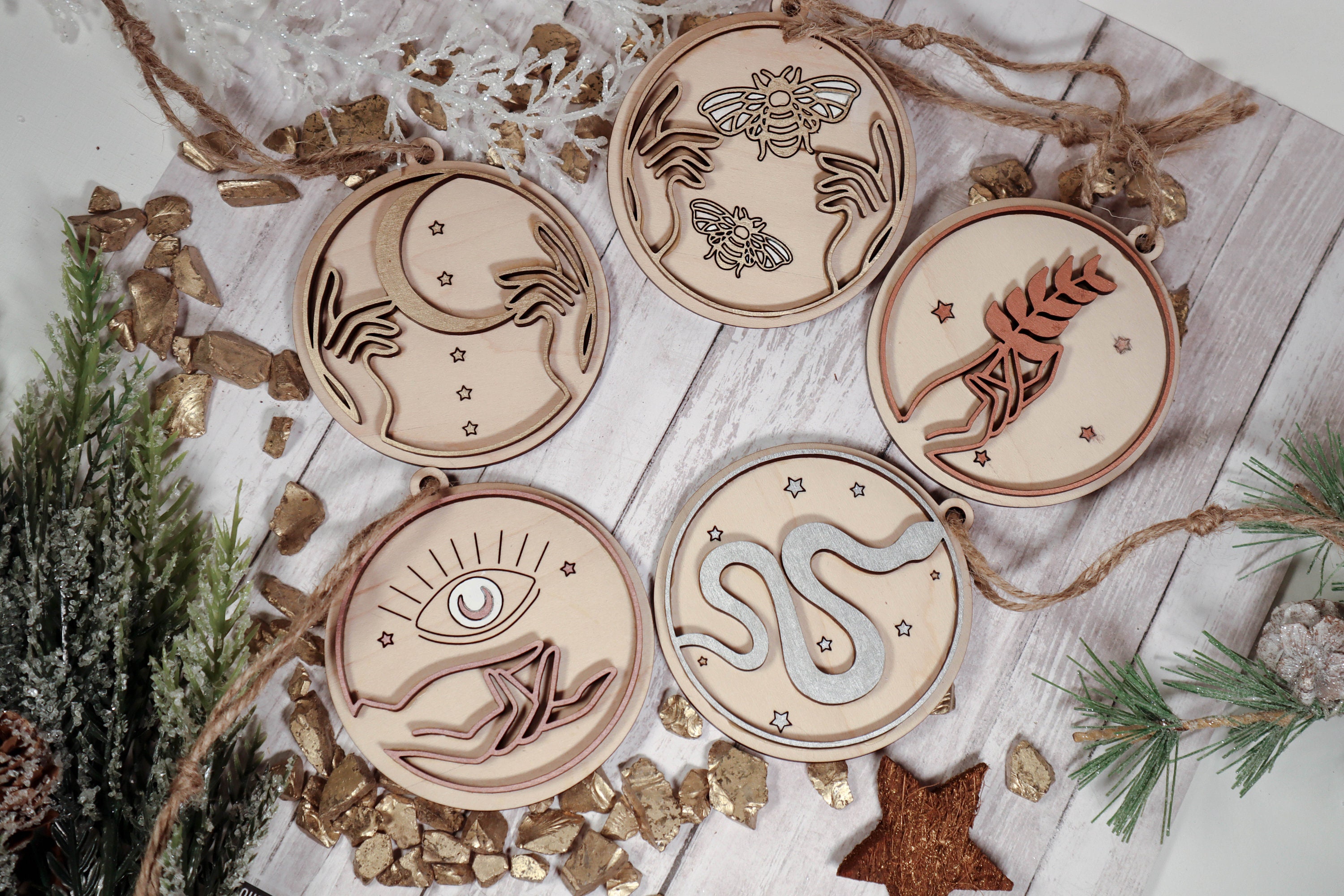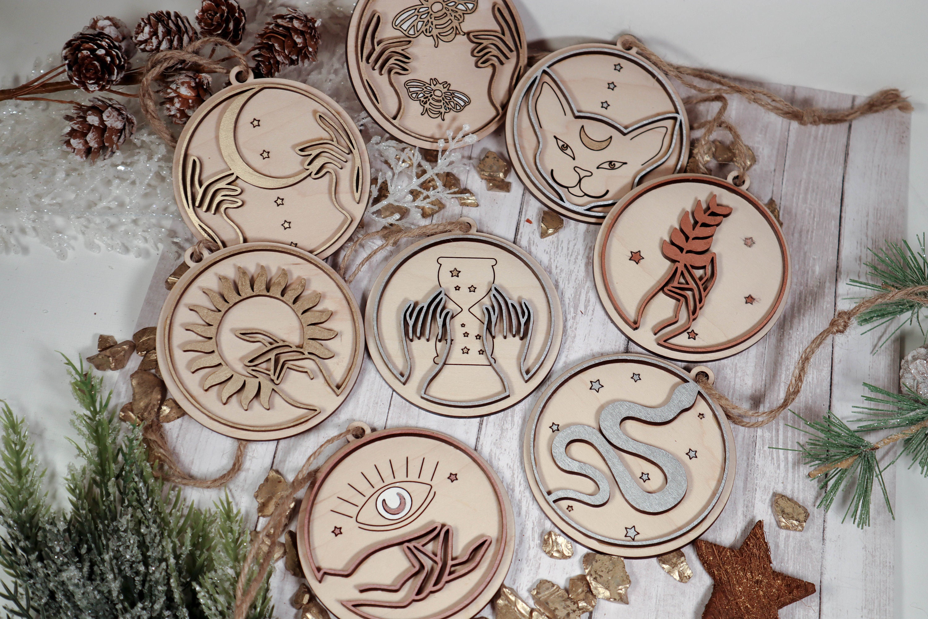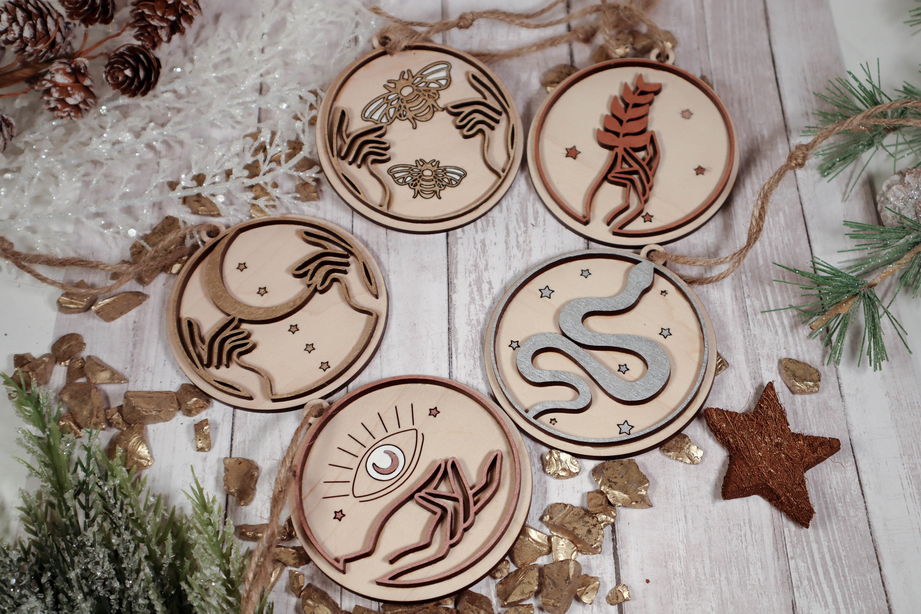 Add a touch of mysticism and enchantment to your tree this holiday season with this beautiful set of Mystic ornaments. Perfect for Yule and witchy décor, these ornaments bring a unique and magical element to your holiday celebrations. Crafted from premium Maple, each ornament hangs from rustic twine, offering a natural, earthy feel. The shimmering gilded accents in gold, rose gold, copper, and silver give each ornament a radiant, celestial glow, while the layered design creates a stunning 3D effect.