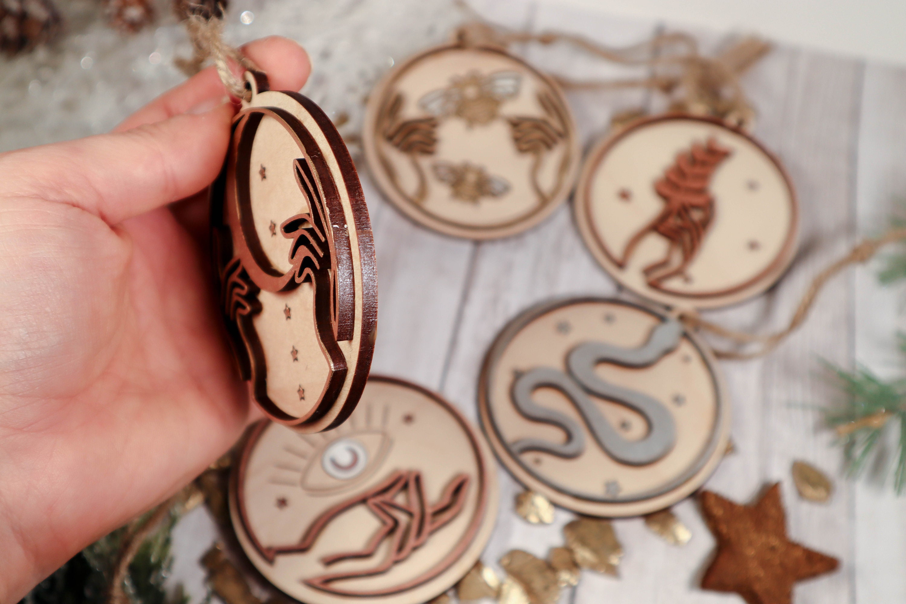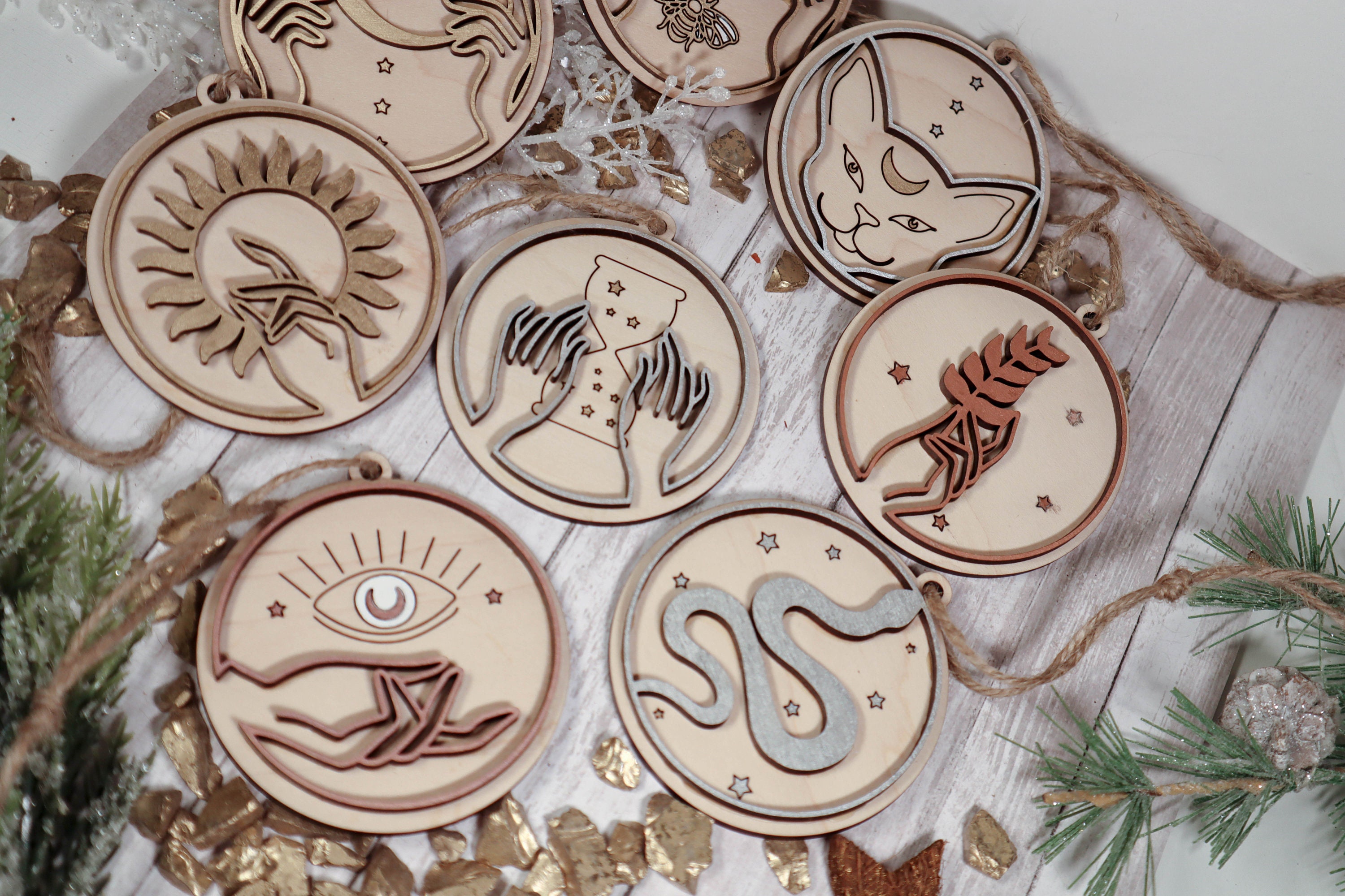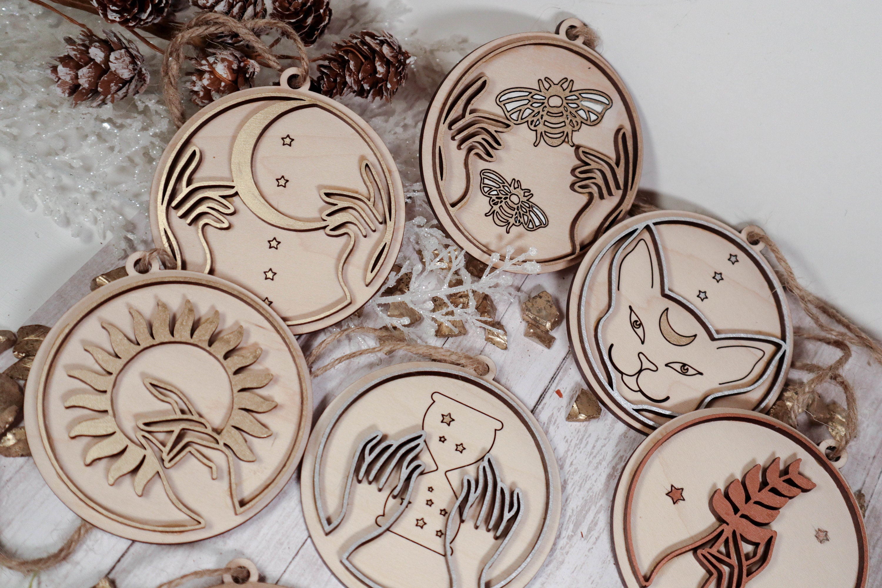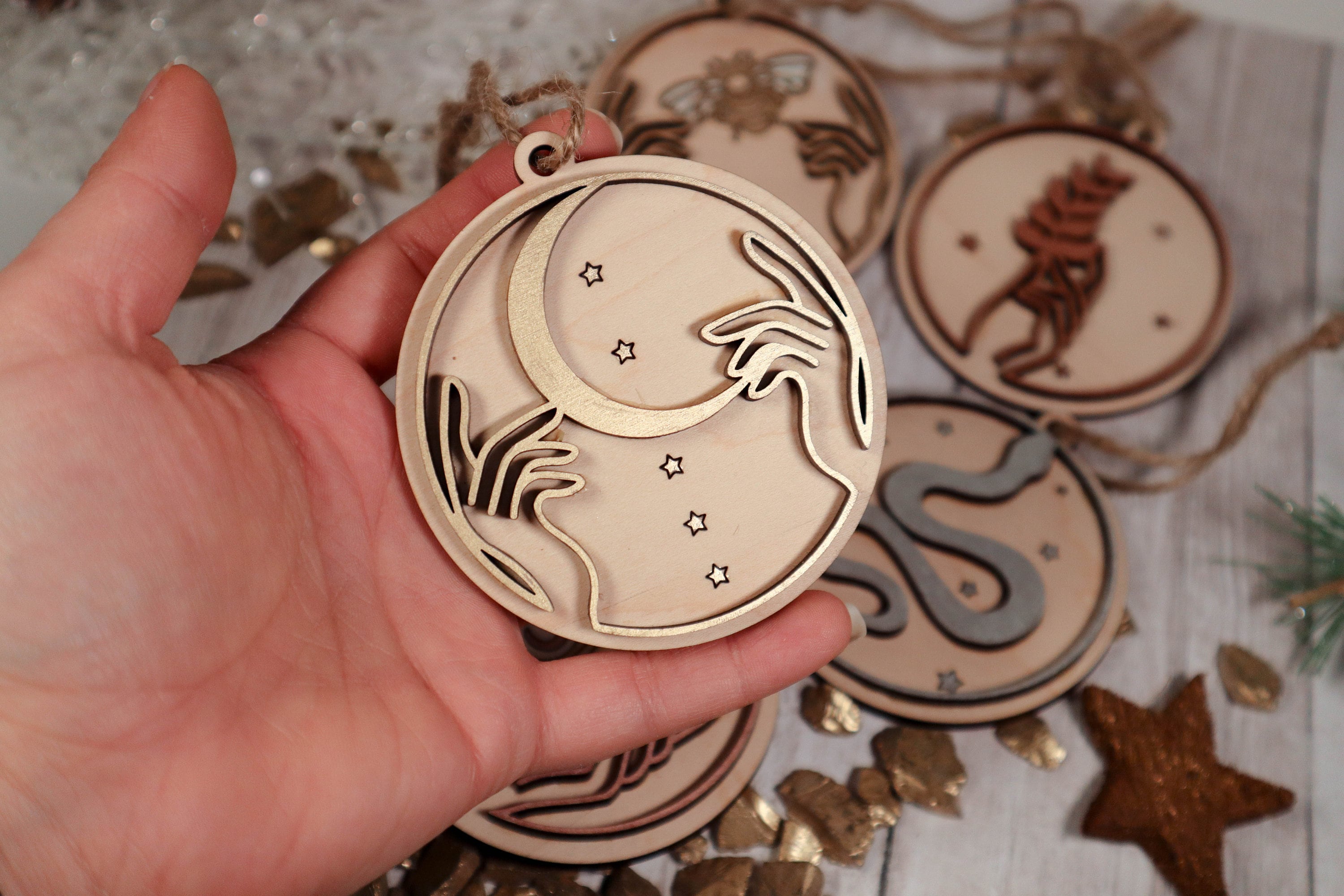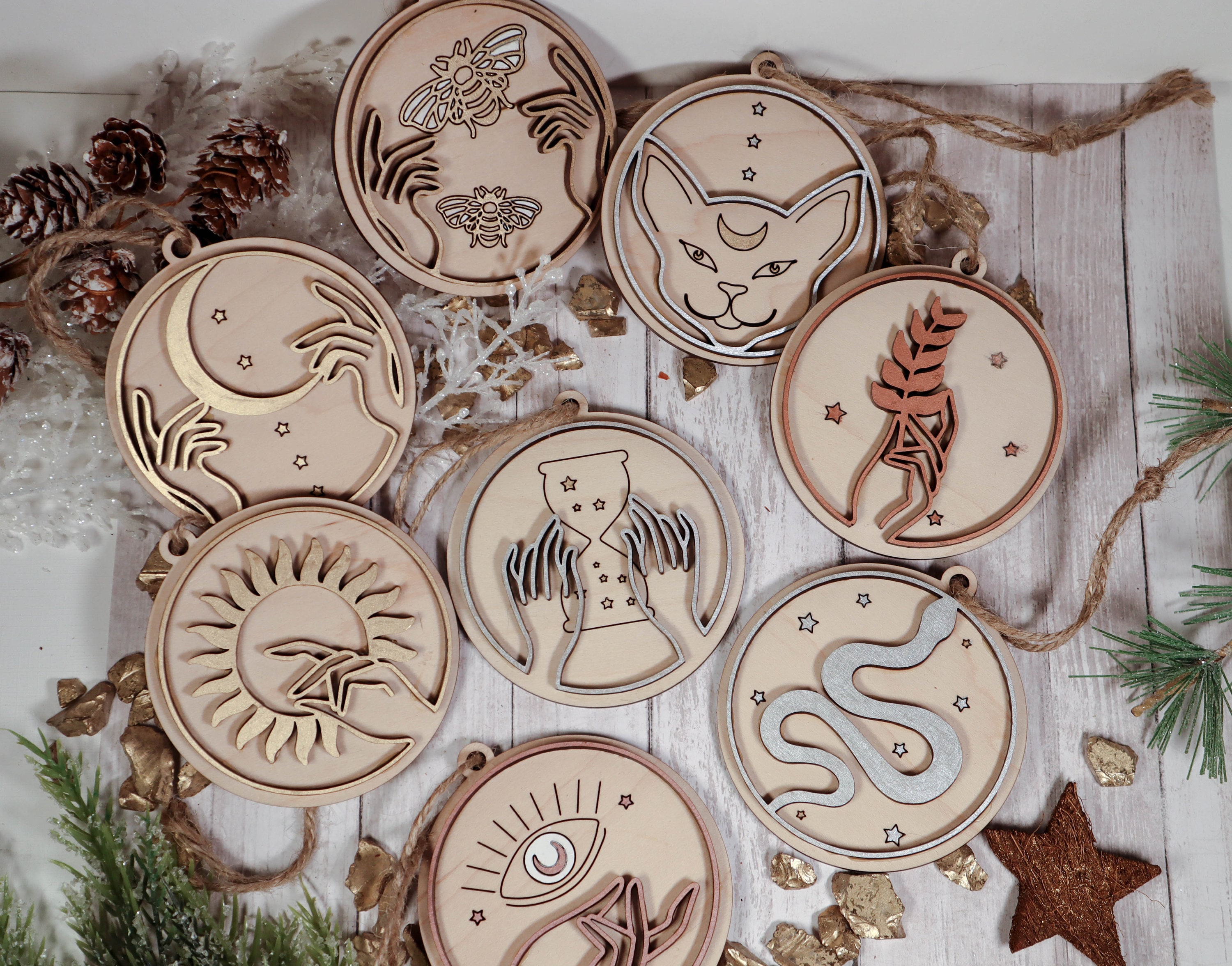 Add a touch of mysticism and enchantment to your tree this holiday season with this beautiful set of Mystic ornaments. Perfect for Yule and witchy décor, these ornaments bring a unique and magical element to your holiday celebrations. Crafted from premium Maple, each ornament hangs from rustic twine, offering a natural, earthy feel. The shimmering gilded accents in gold, rose gold, copper, and silver give each ornament a radiant, celestial glow, while the layered design creates a stunning 3D effect.