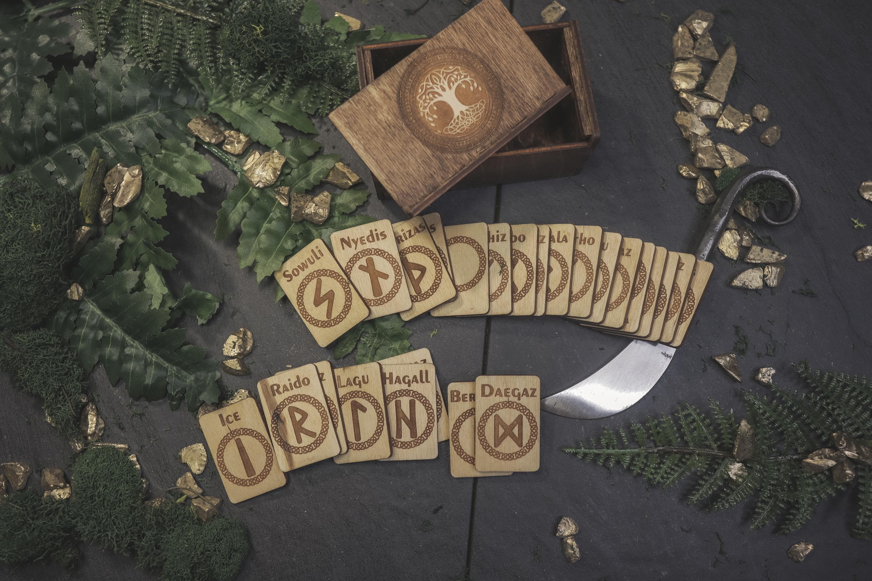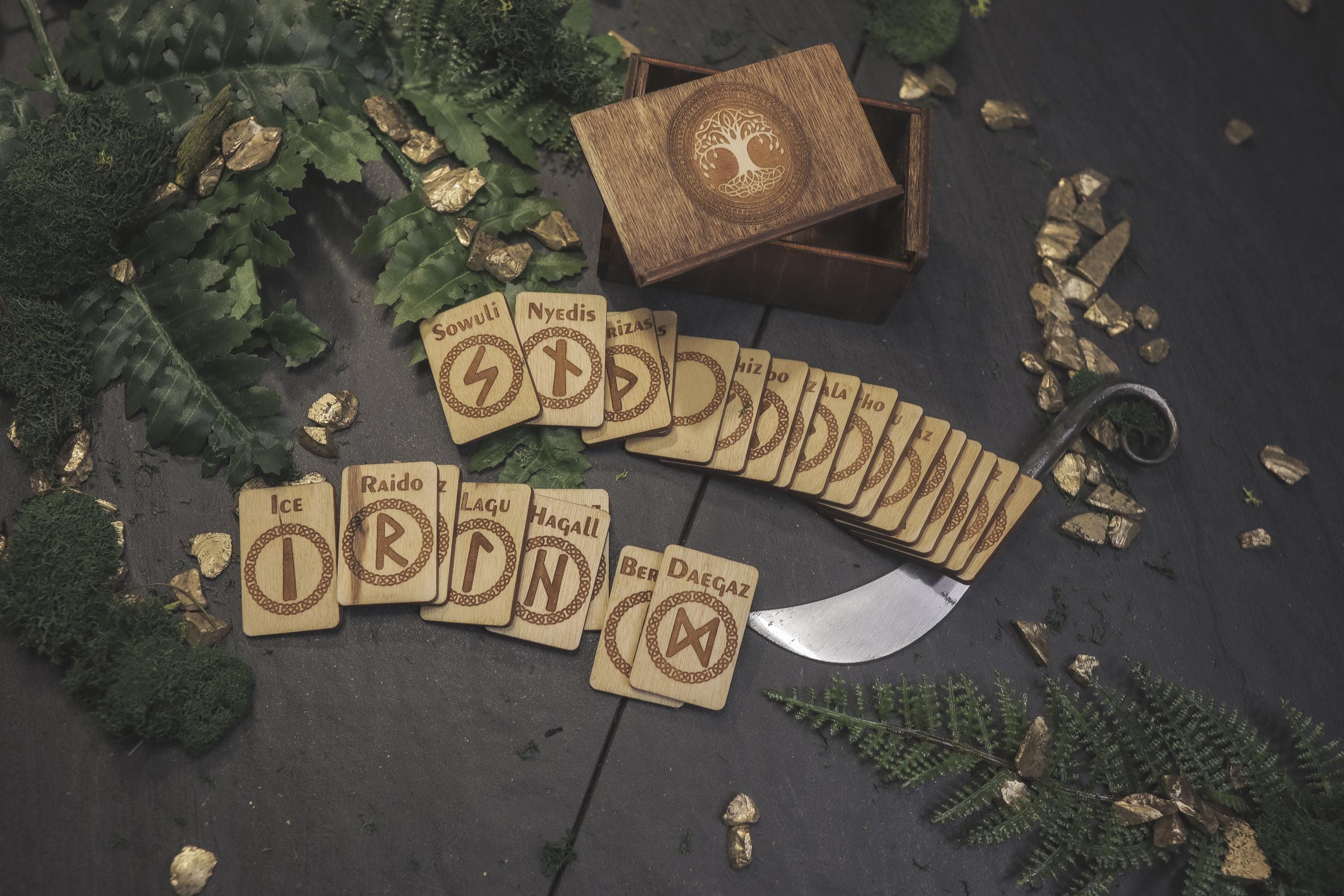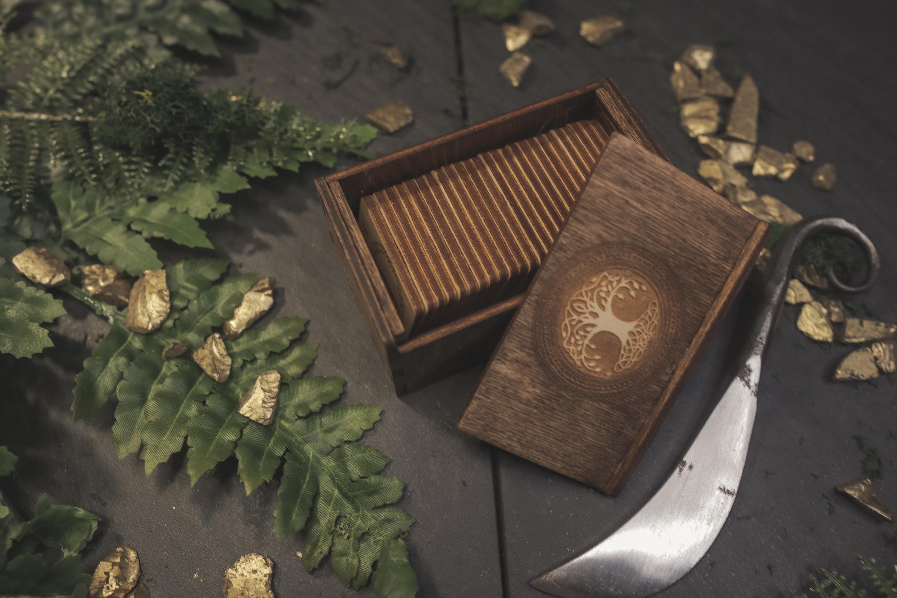 Discover the ancient wisdom of the Norse with this beautifully handcrafted Viking Elder Futhark Rune Set. The runes are carefully laser cut and fit perfectly within the Baltic Birch storage box, which is stained and sealed for long-lasting durability. This set is ideal for those seeking a travel-friendly divination tool or for witches who prefer to keep their rune sets compact and portable. The box lid is designed to fit snugly into the grooves, ensuring your runes are safely stored during travel or at home on your altar. The Elder Futhark runes are one of the oldest and most powerful forms of divination. Each rune symbolizes deep meanings and energies, making this set perfect for spiritual exploration, decision-making, or insight into life's questions.