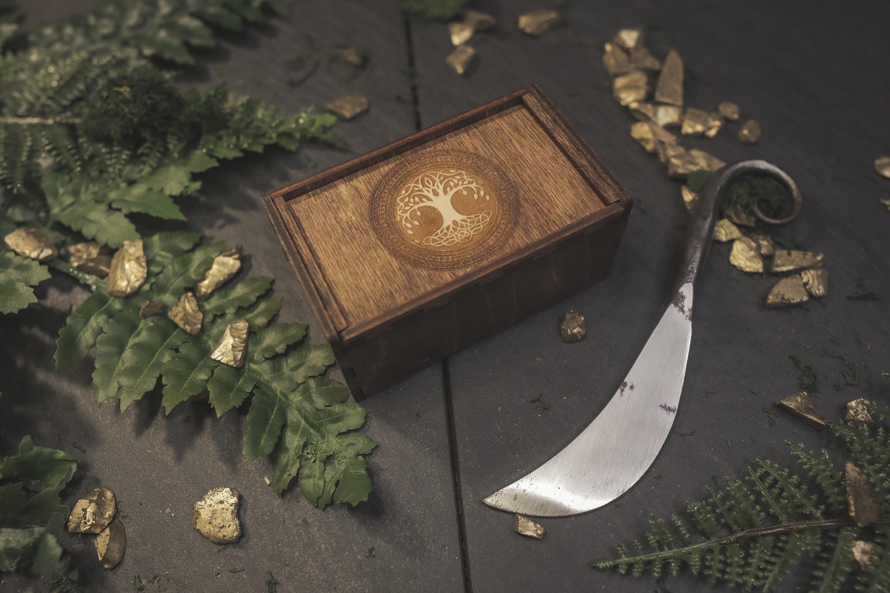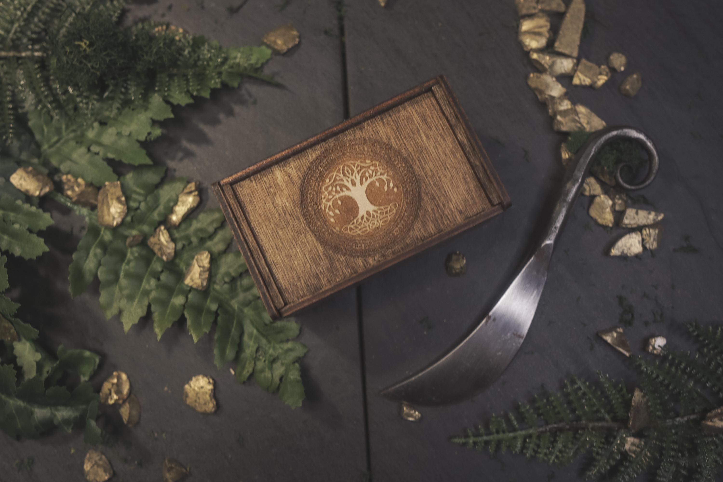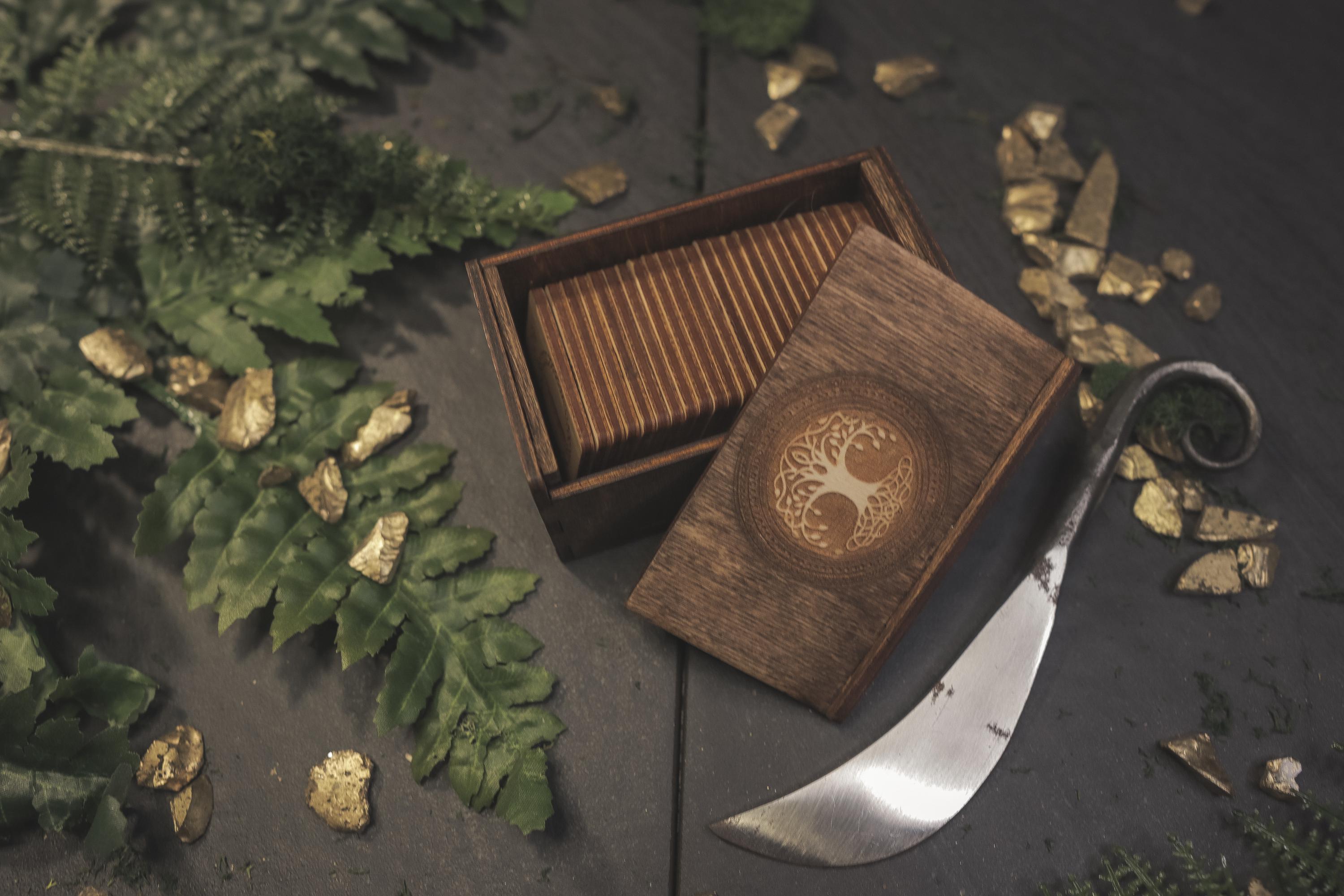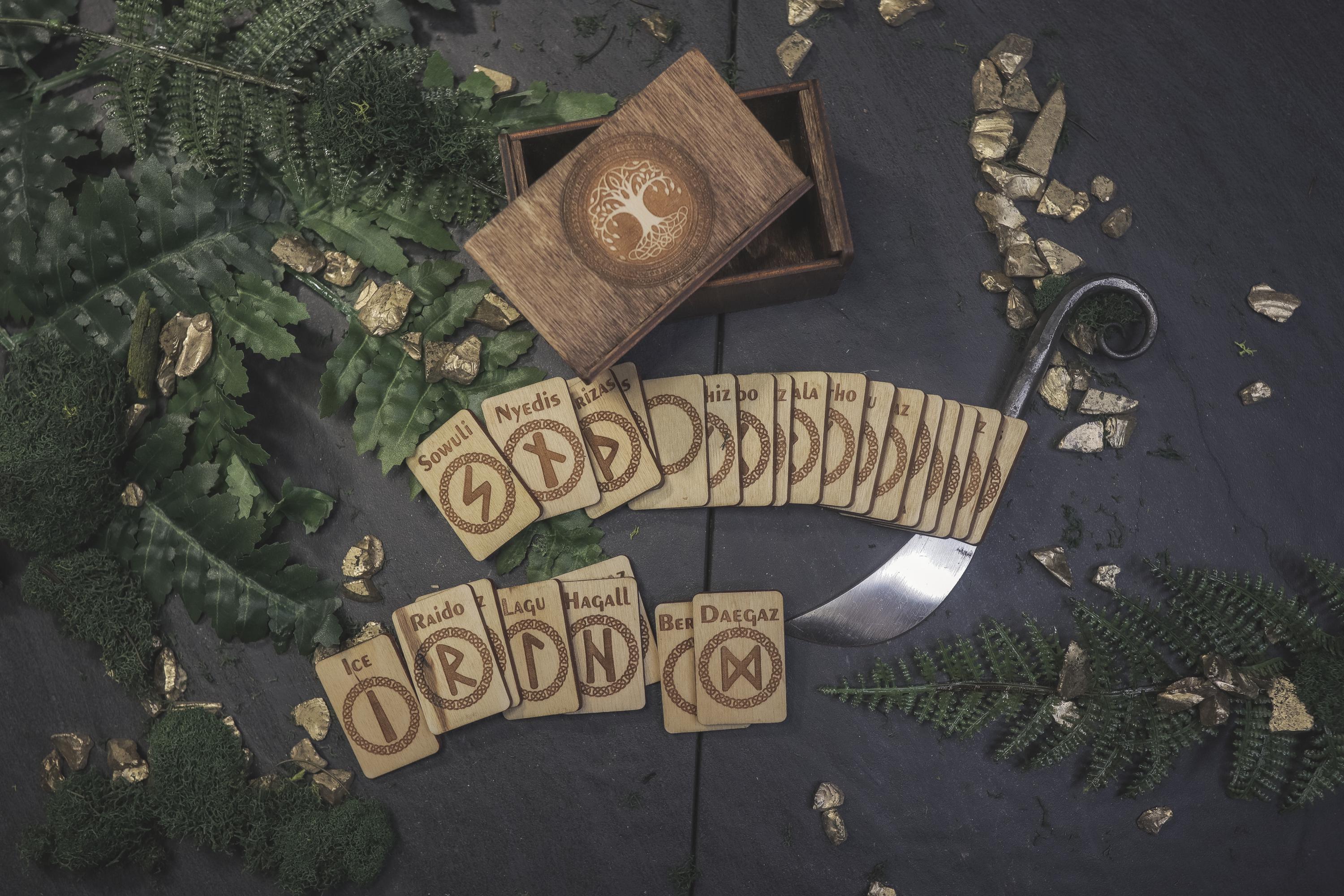 Discover the ancient wisdom of the Norse with this beautifully handcrafted Viking Elder Futhark Rune Set. The runes are carefully laser cut and fit perfectly within the Baltic Birch storage box, which is stained and sealed for long-lasting durability. This set is ideal for those seeking a travel-friendly divination tool or for witches who prefer to keep their rune sets compact and portable. The box lid is designed to fit snugly into the grooves, ensuring your runes are safely stored during travel or at home on your altar. The Elder Futhark runes are one of the oldest and most powerful forms of divination. Each rune symbolizes deep meanings and energies, making this set perfect for spiritual exploration, decision-making, or insight into life's questions.