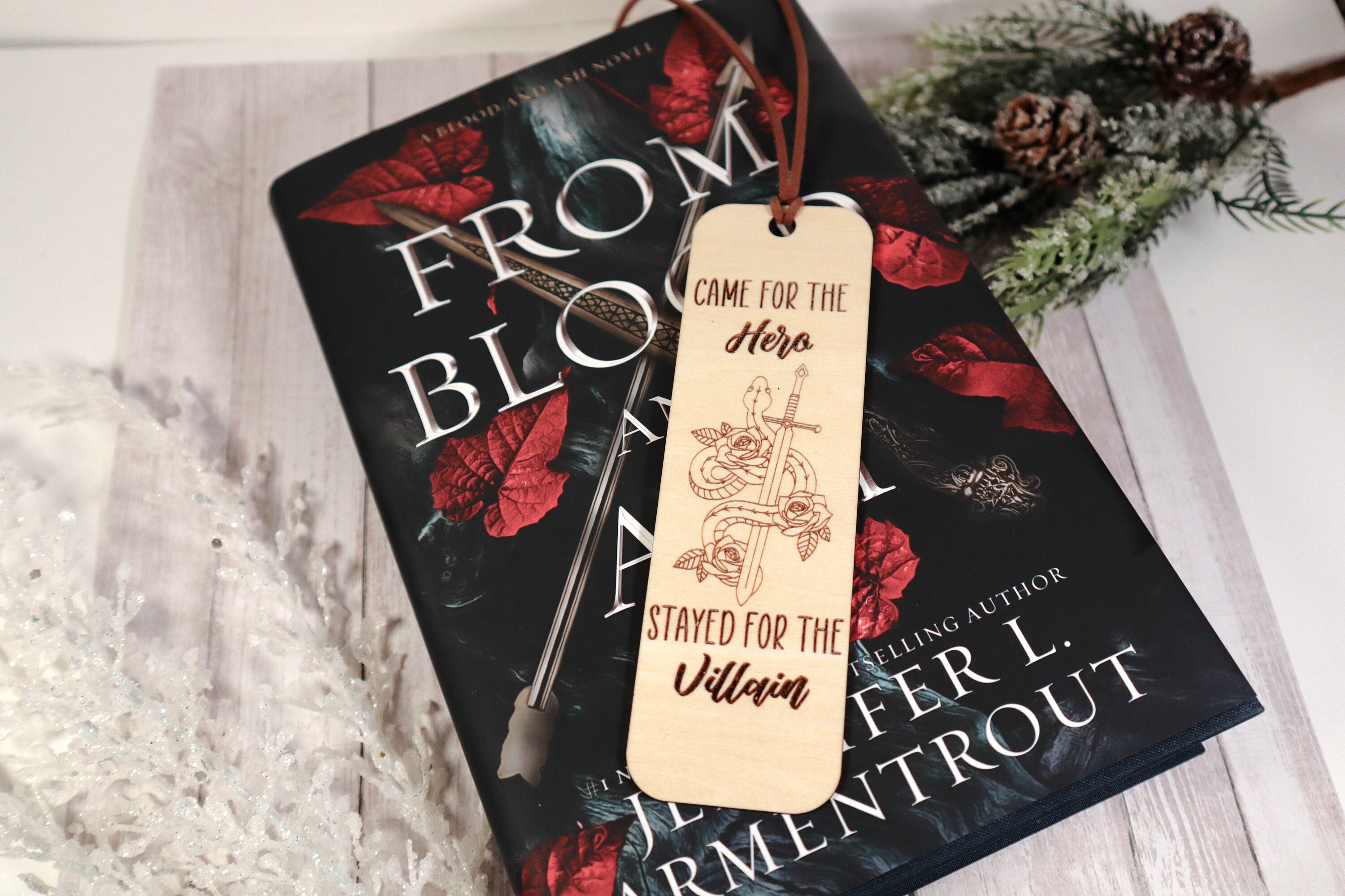 This bookmark is made from 1/16" thin Balsa Wood and is laser engraved with a design that says Came for the Hero, Stayed for the Villain and has a snake around a sword in the middle of the words. There is a suede cord attached to the top of the bookmark so that can stick out of your book.