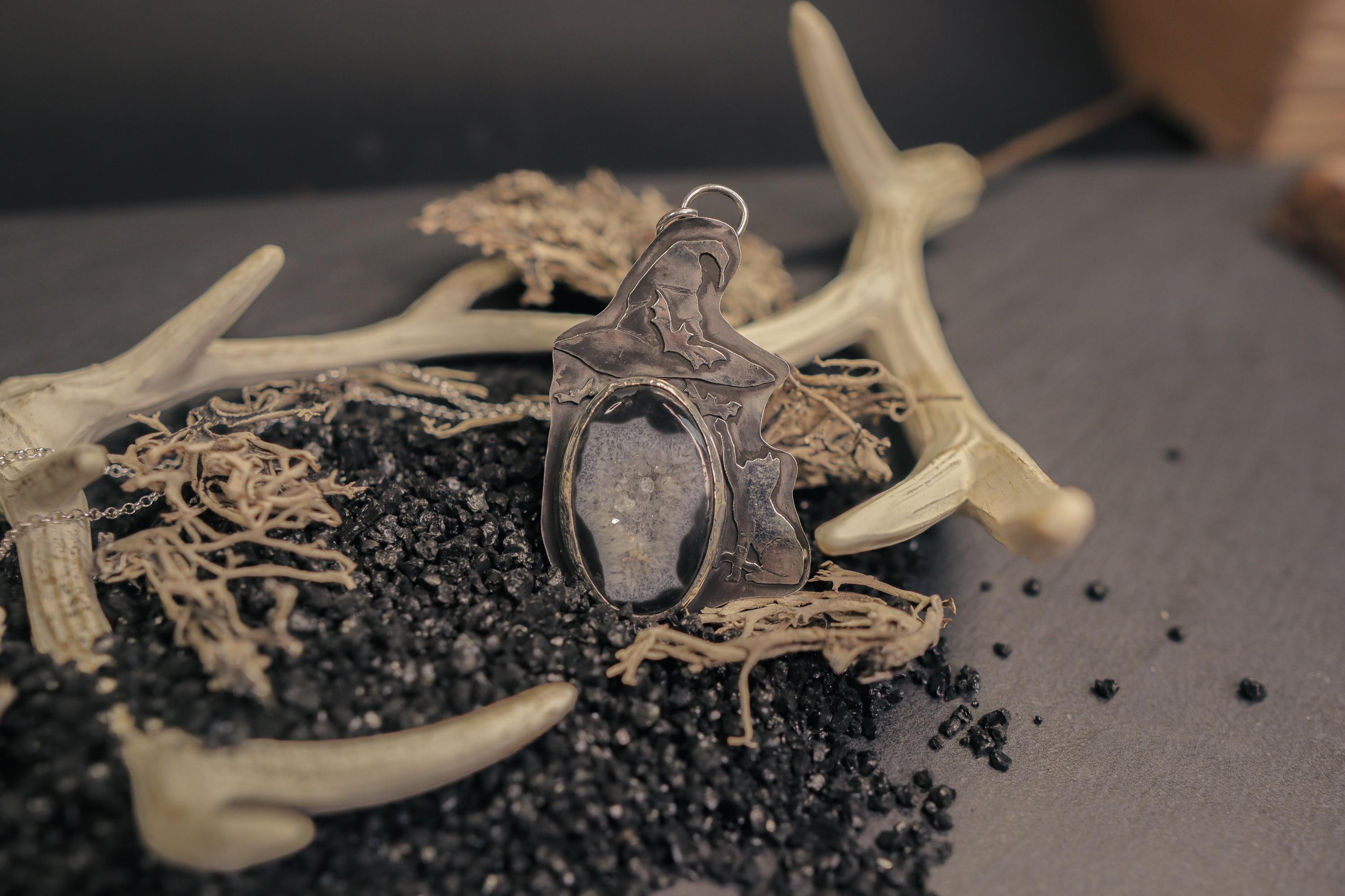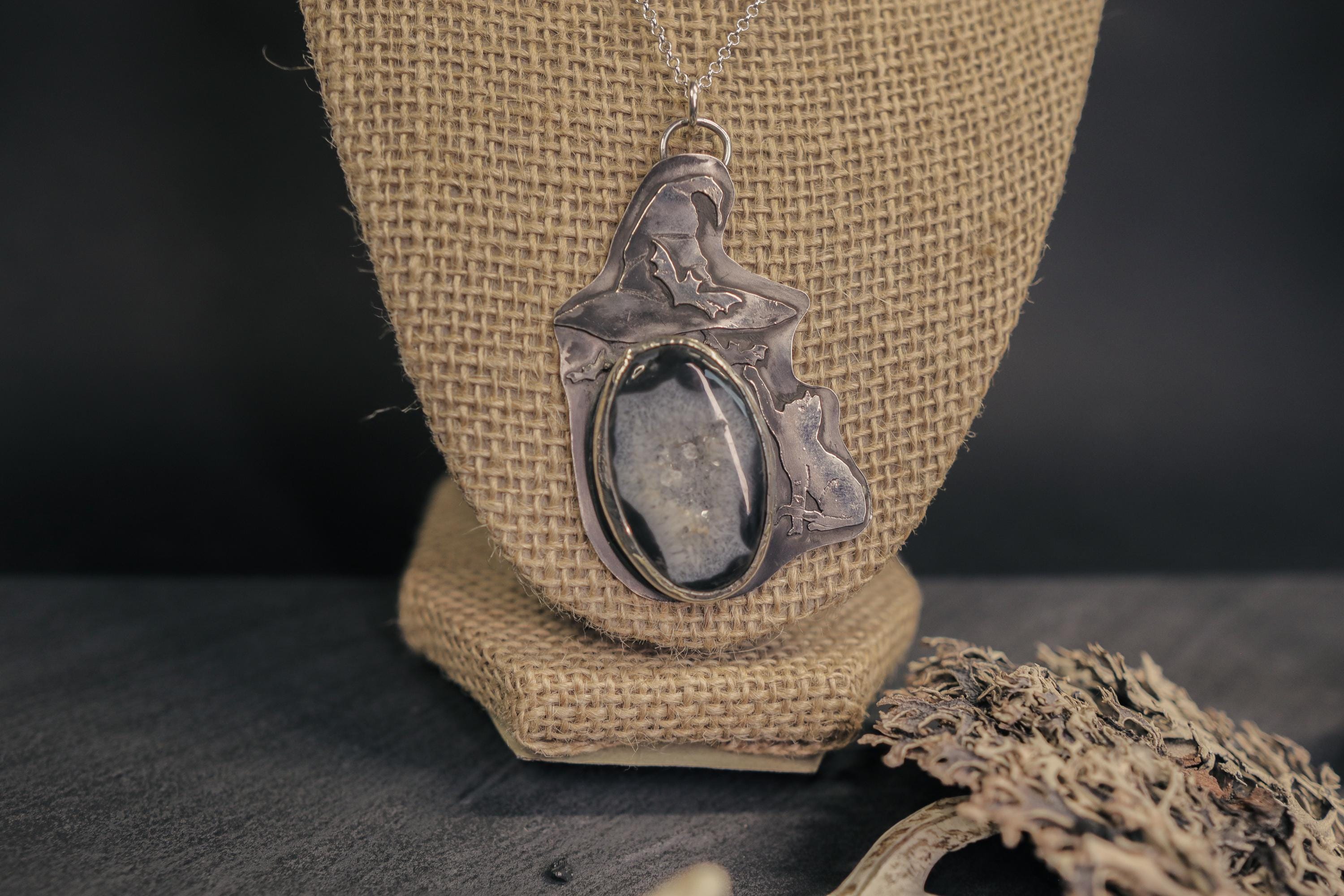 Step into the magic of Samhain with this handcrafted sterling silver pendant featuring a mesmerizing black onyx druzy gemstone. The stone displays a stunning milky white center filled with natural sparkle, creating the perfect mystical focal point. Above the bezel-set gemstone rests an intricately crafted witch hat adorned with a tiny bat, while a curious cat reaches up toward it—surrounded by fluttering bats that add even more witchy charm.