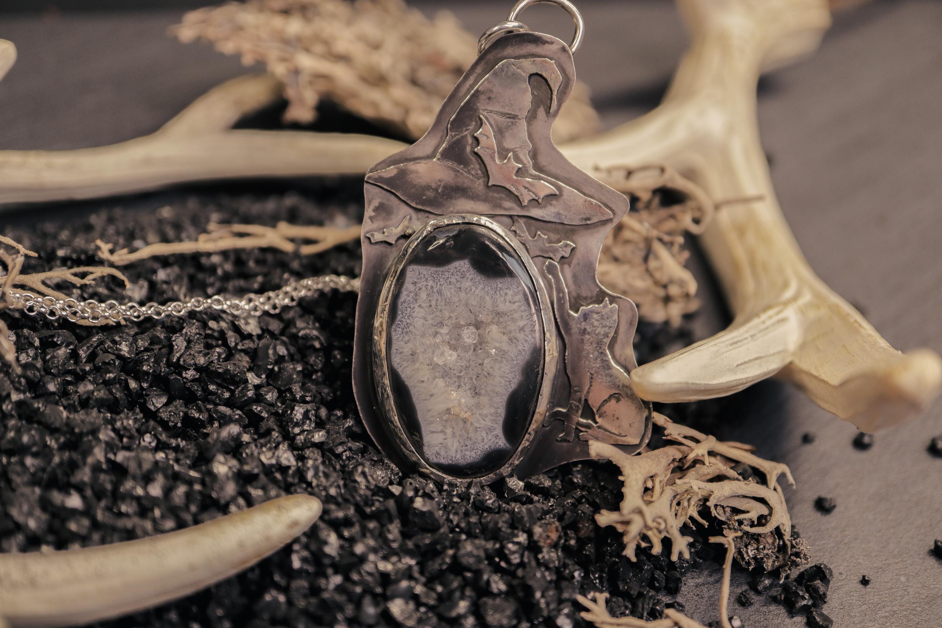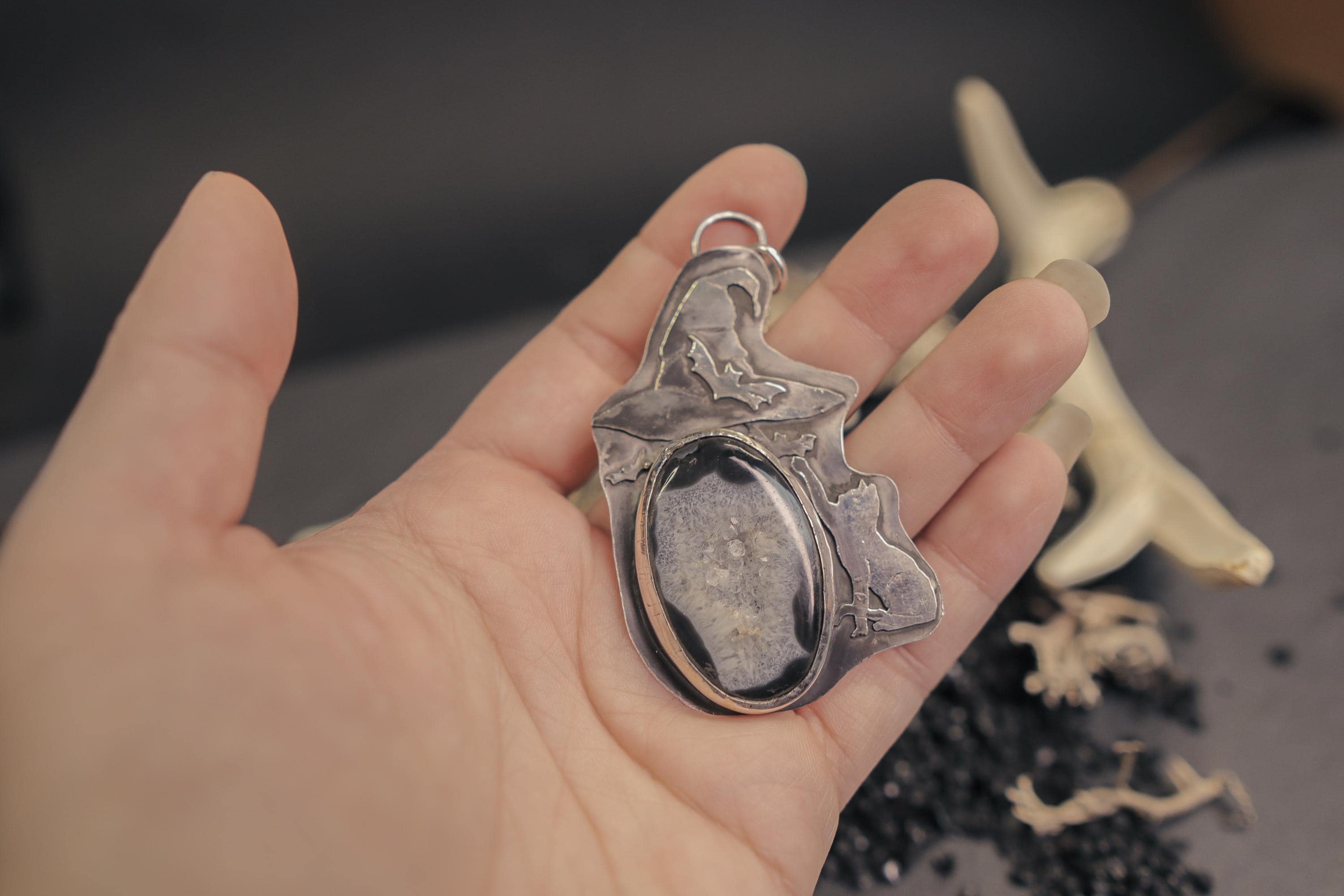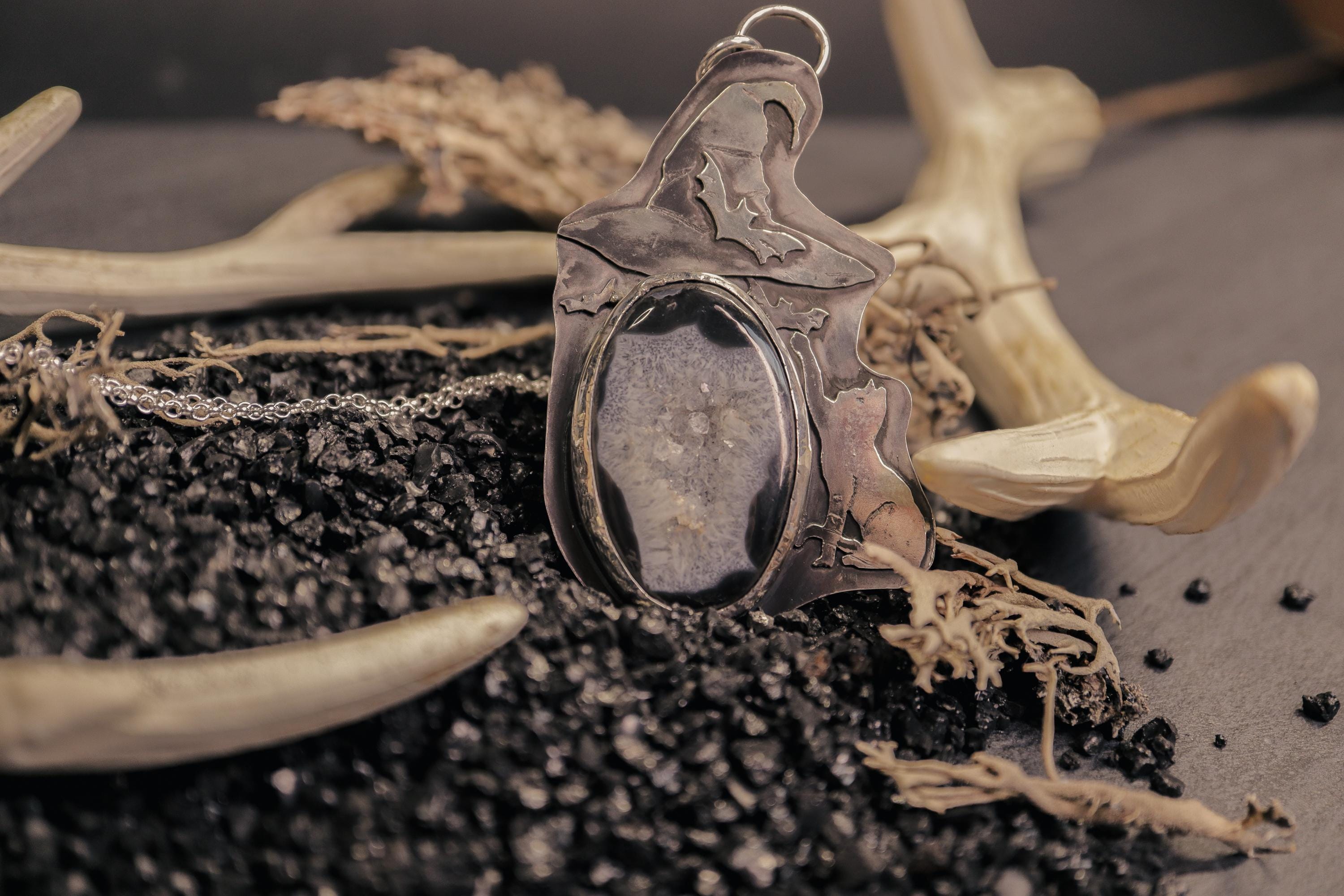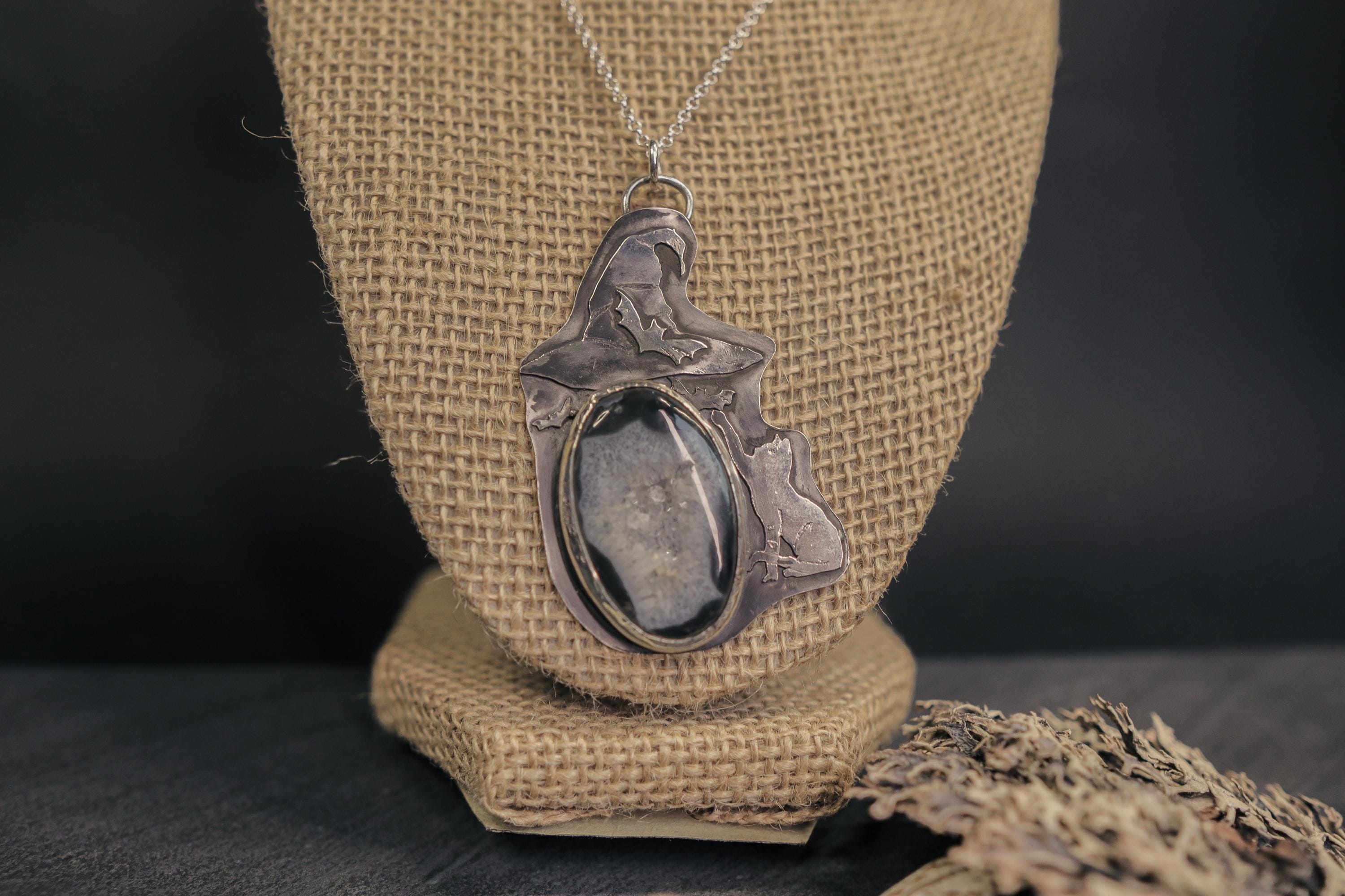 Finished with a matte, darkened patina to enhance each sculpted detail, this pendant brings together whimsy, shadow, and elegance. It hangs from a sturdy 2mm sterling silver rolo chain, making it an enchanting statement piece for Samhain, Halloween, or year-round witchy style.