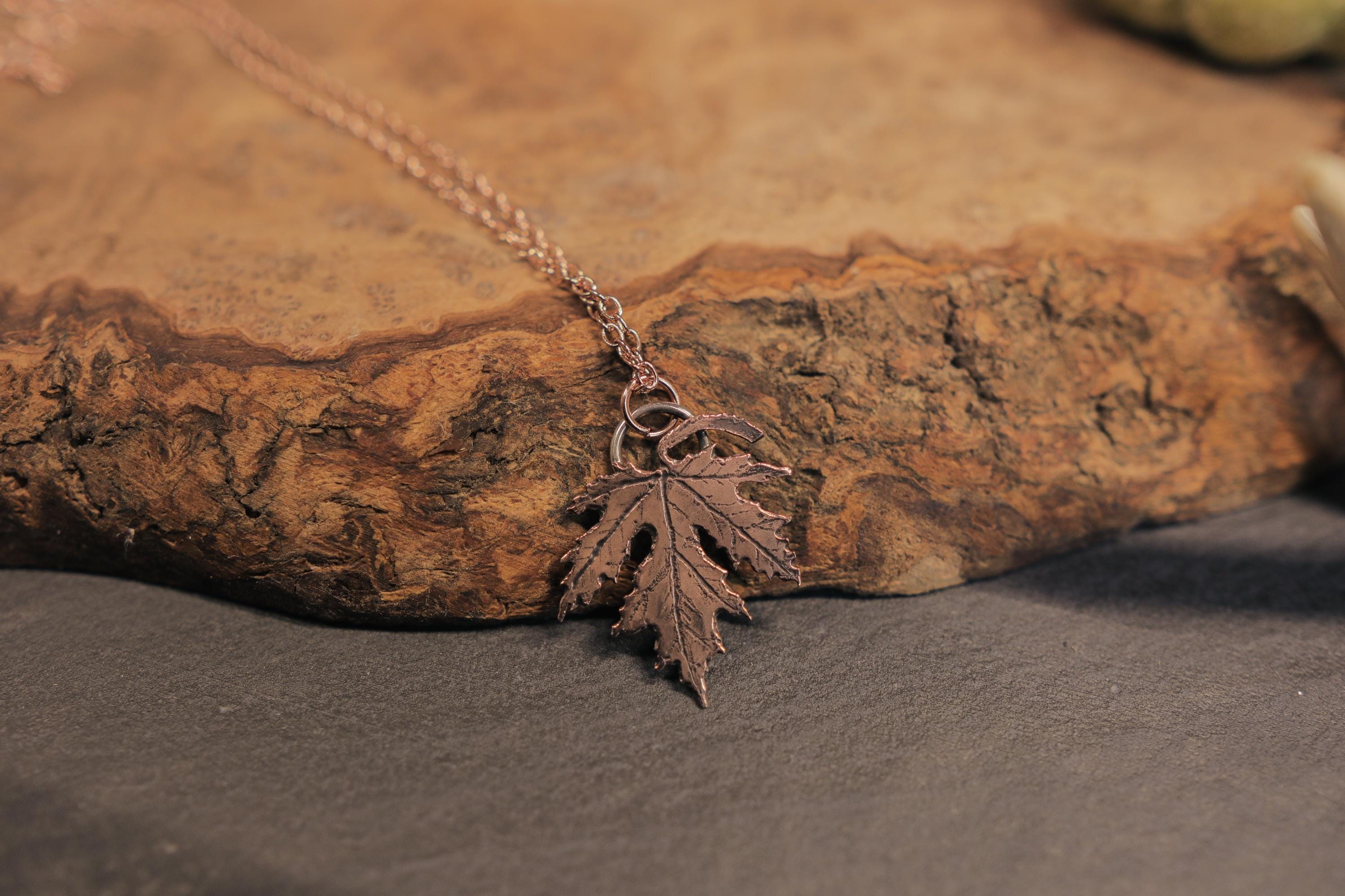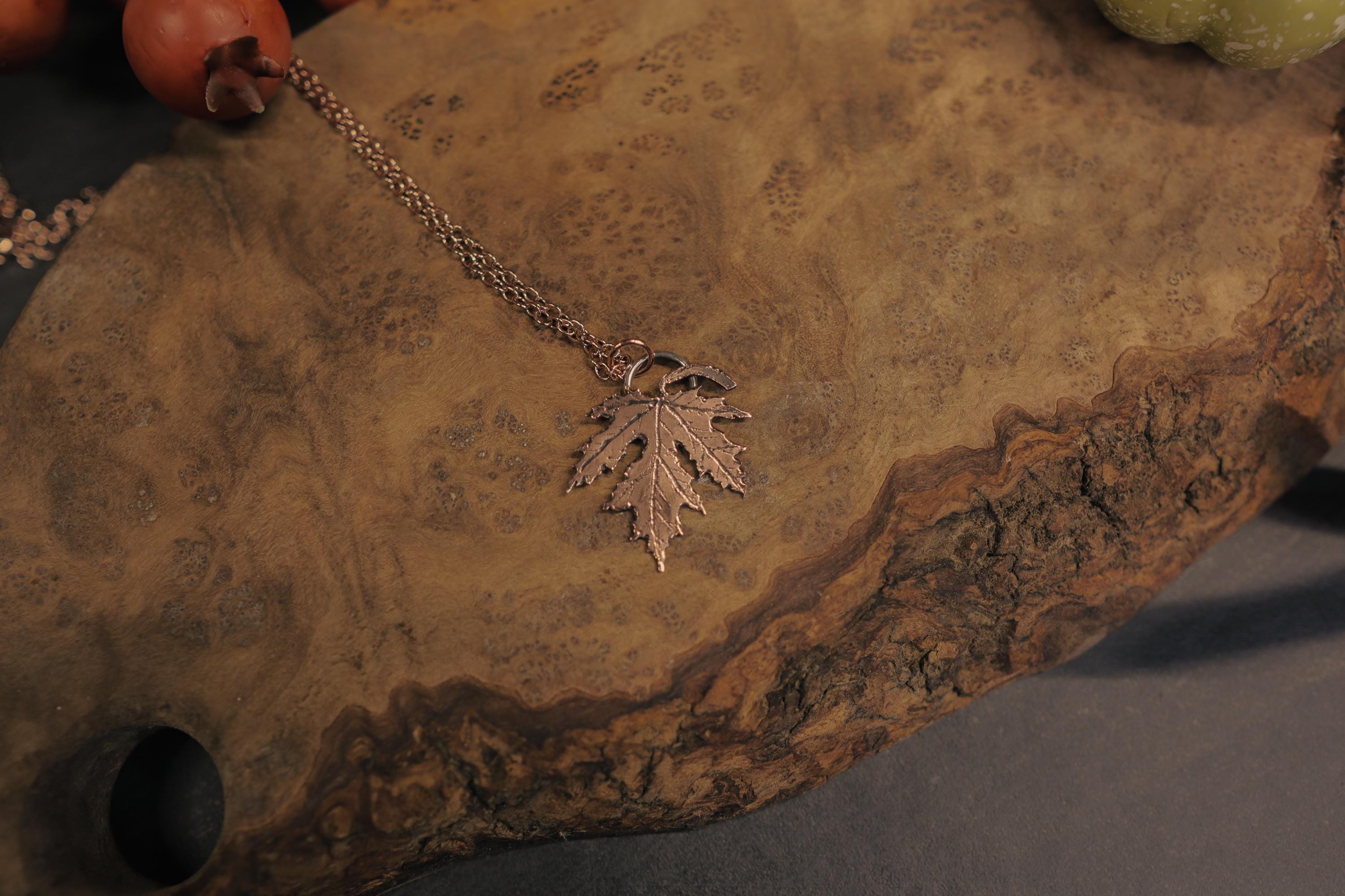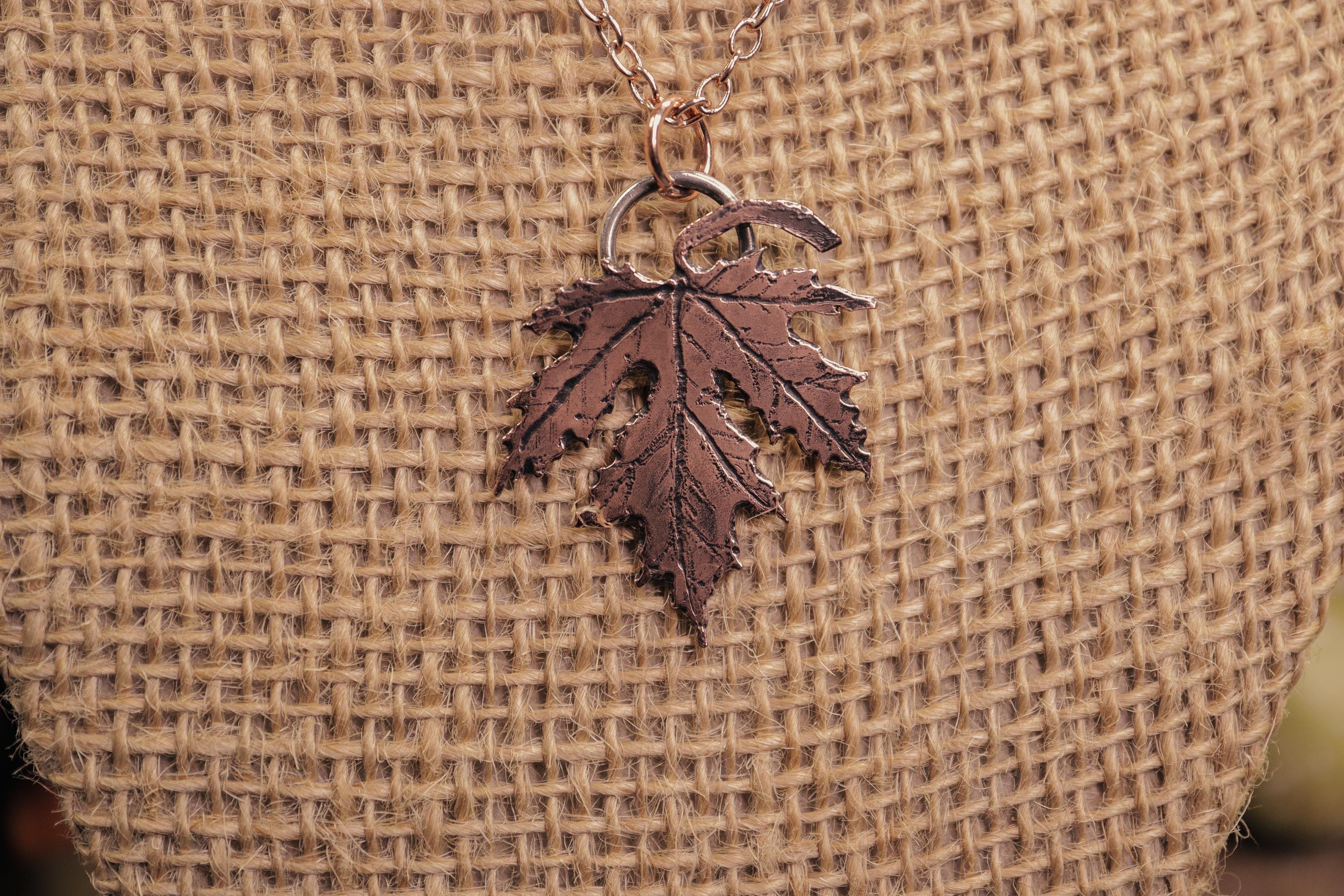 The pendant hangs on an 18-inch rose gold plated sterling silver chain that adds a soft shimmer and warm elegance to the overall look. Whether worn daily or as a seasonal favorite, this necklace captures the essence of falling leaves and crisp autumn air.