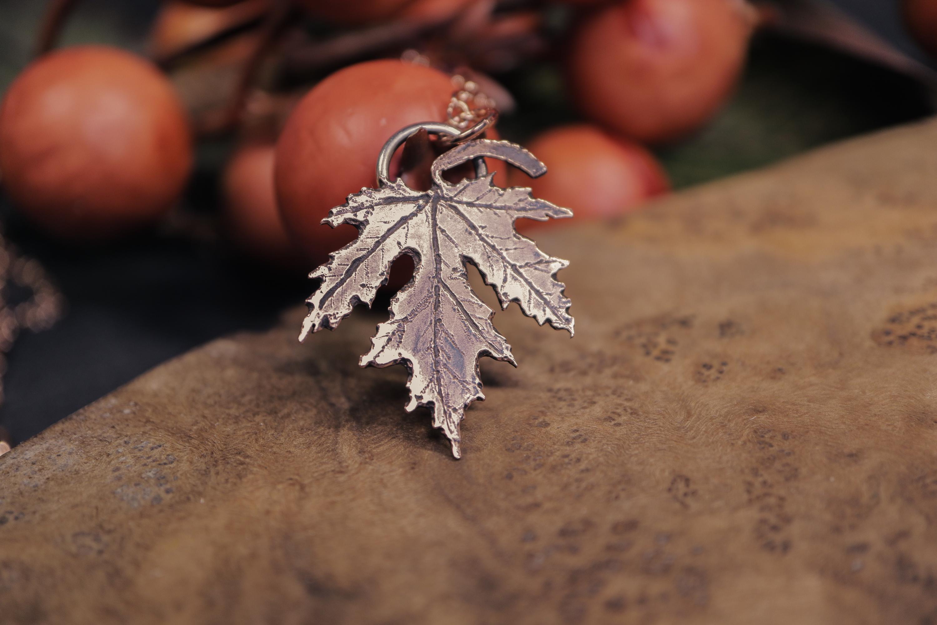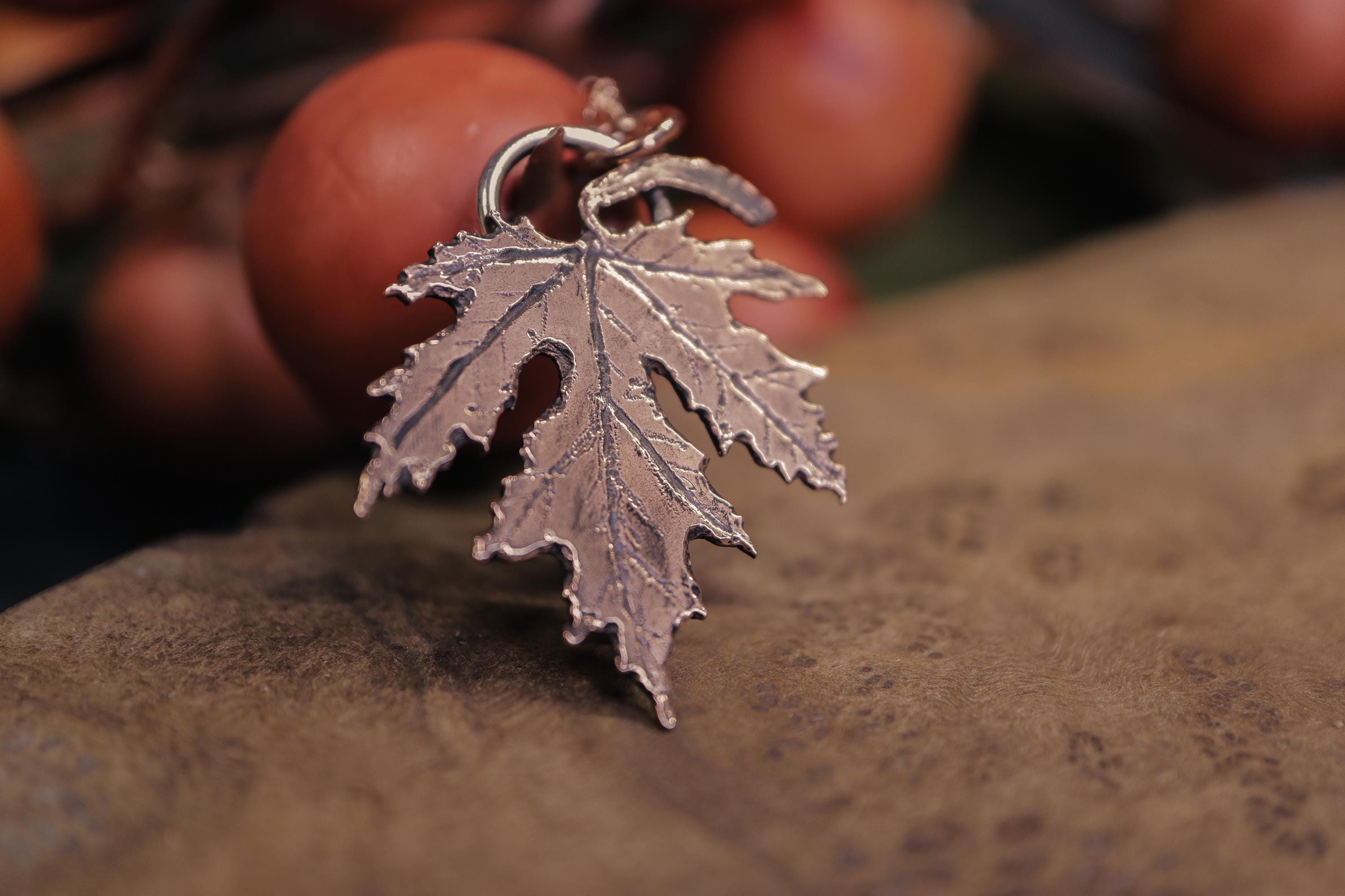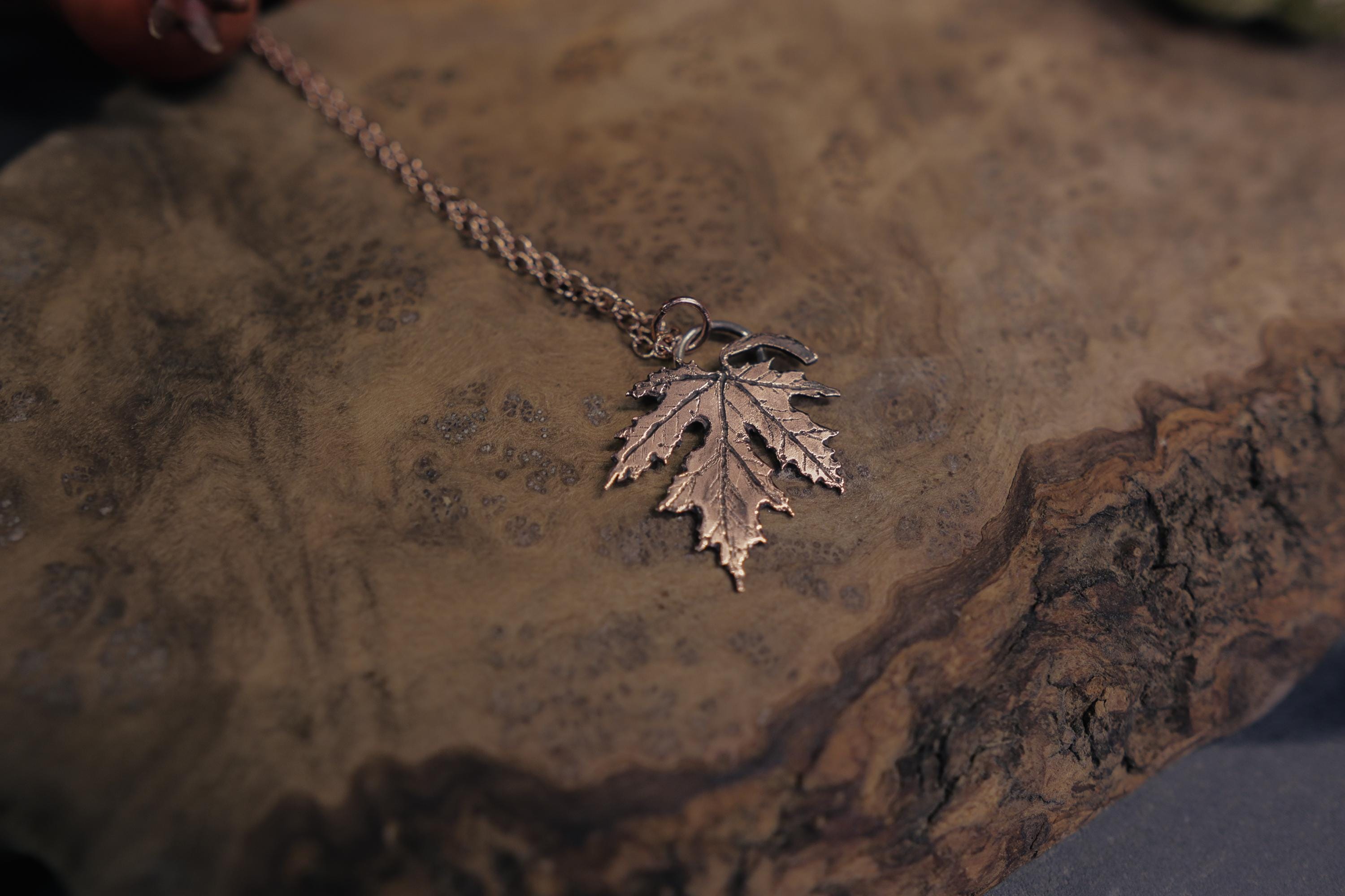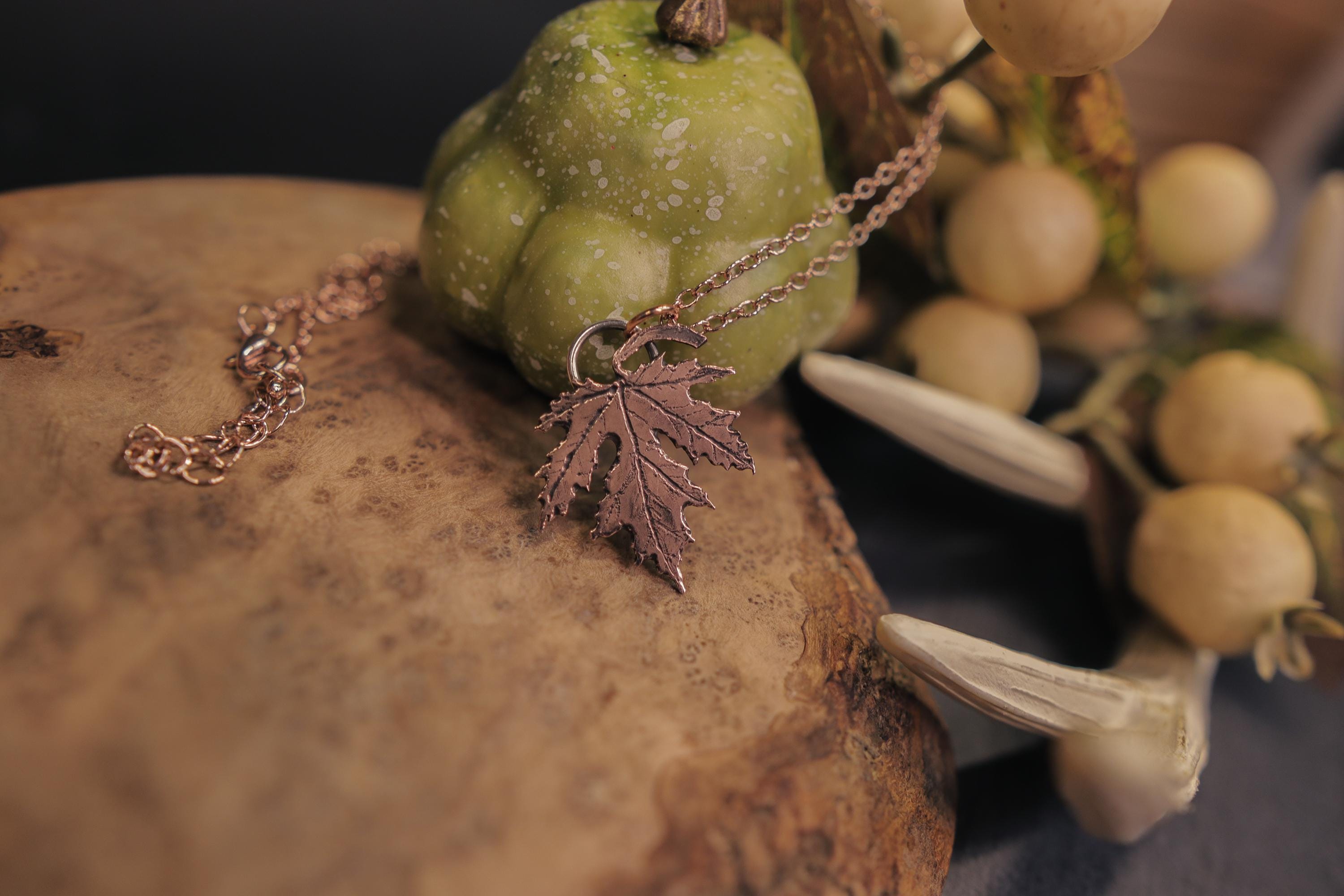 The pendant hangs on an 18-inch rose gold plated sterling silver chain that adds a soft shimmer and warm elegance to the overall look. Whether worn daily or as a seasonal favorite, this necklace captures the essence of falling leaves and crisp autumn air.
