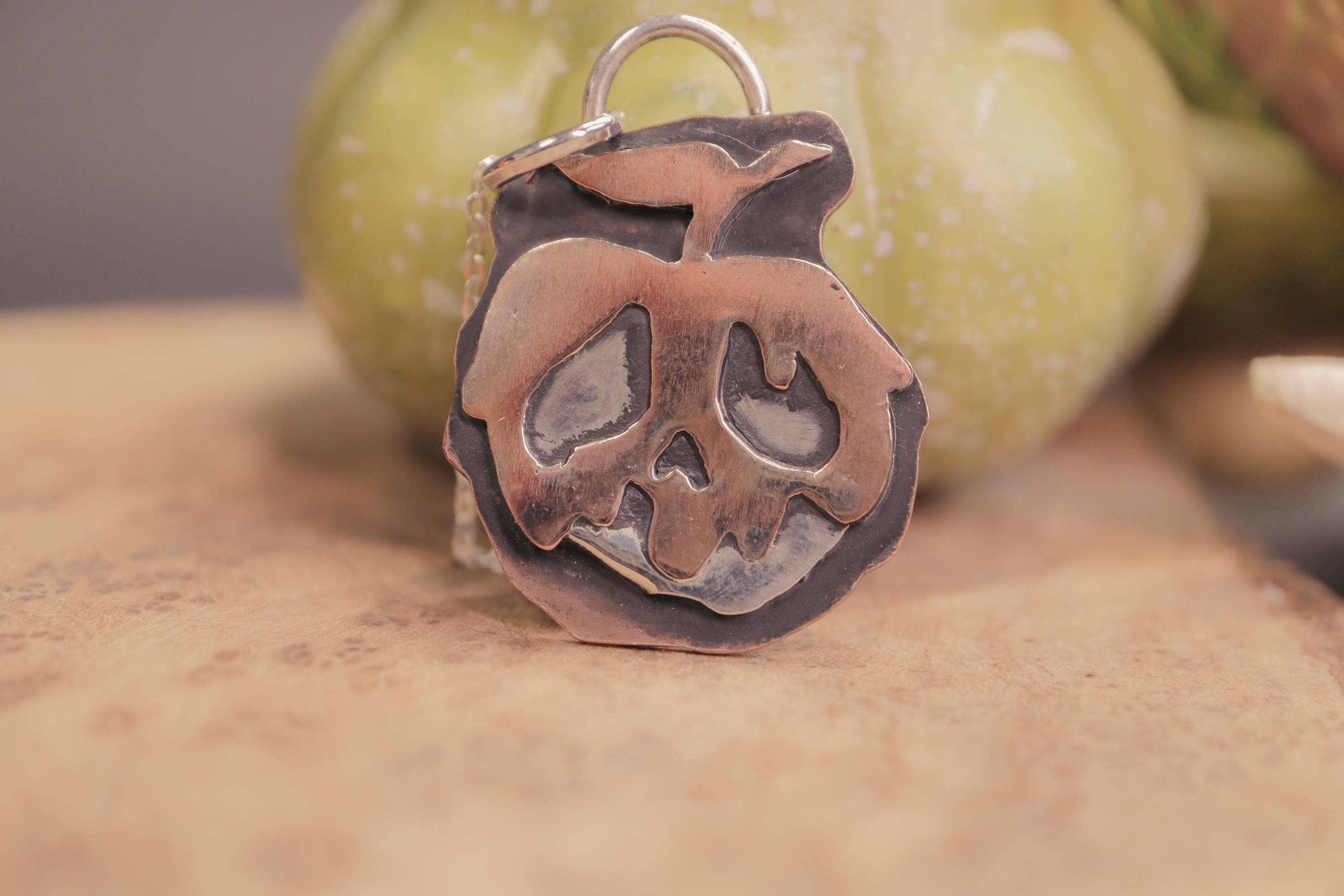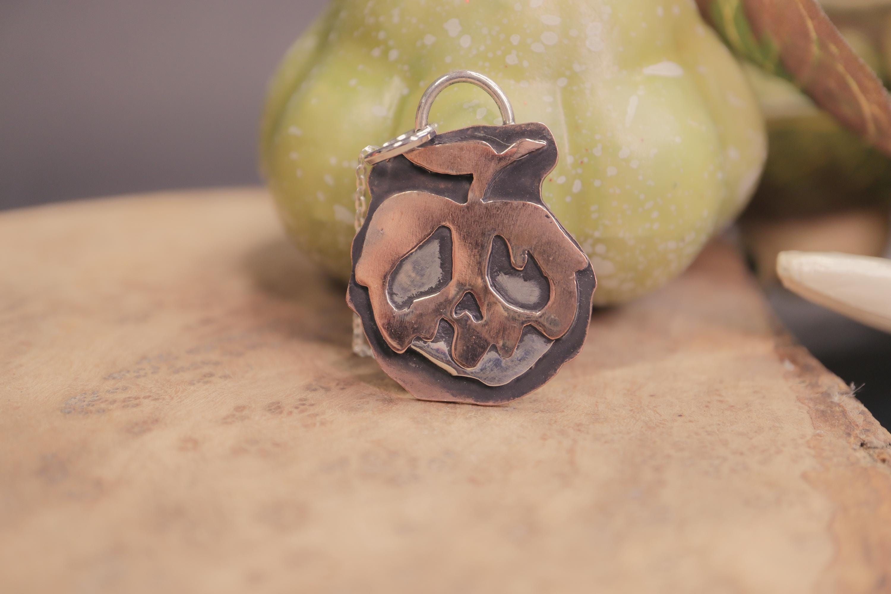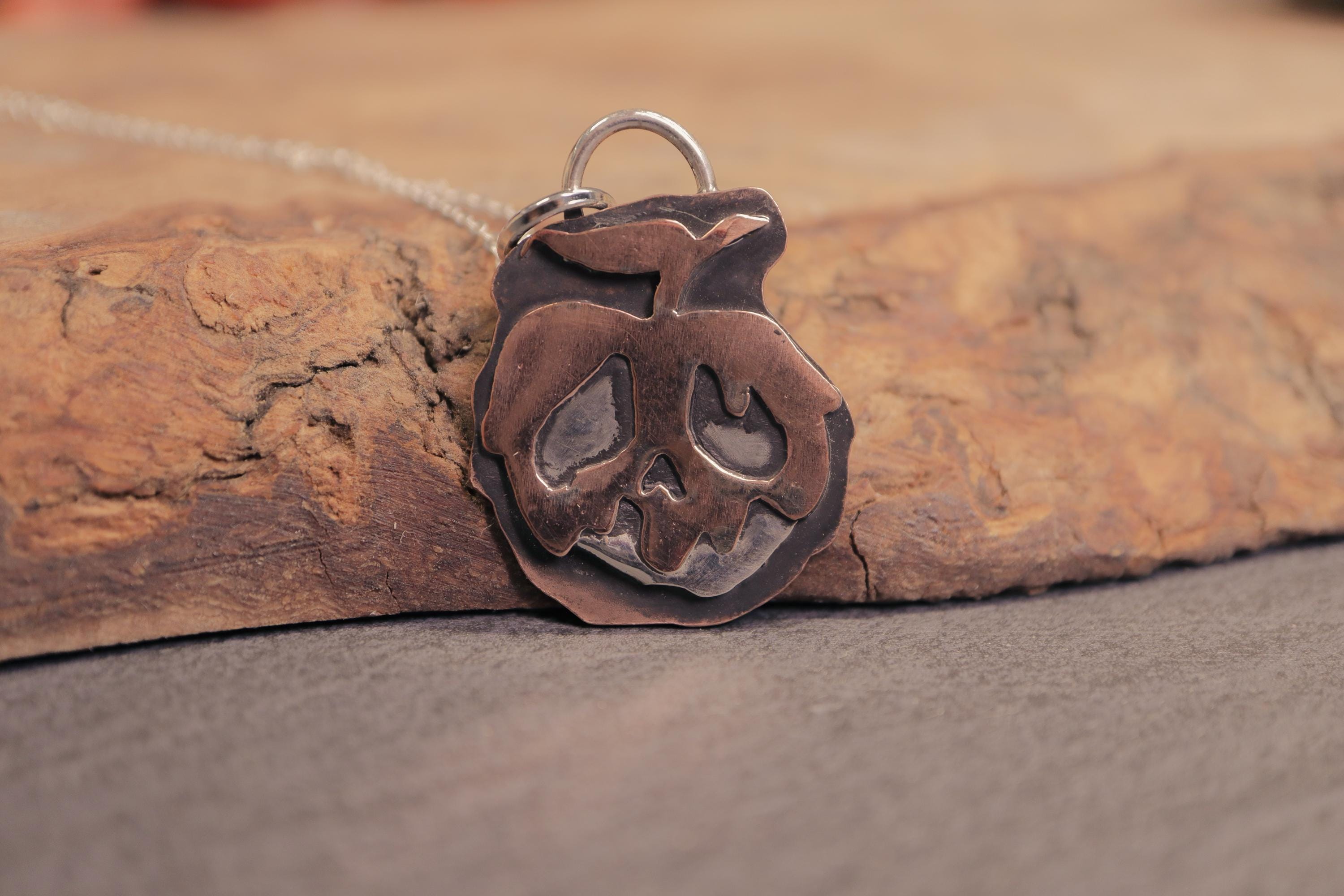 Celebrate the magic of Samhain with this enchanting Samhain Poison Apple Pendant, handcrafted from sterling silver and copper. The apple itself is sculpted in bright silver, while the dripping “poison” and backplate are made from warm, earthy copper—creating a striking mixed‑metal contrast inspired by classic witchy folklore.
