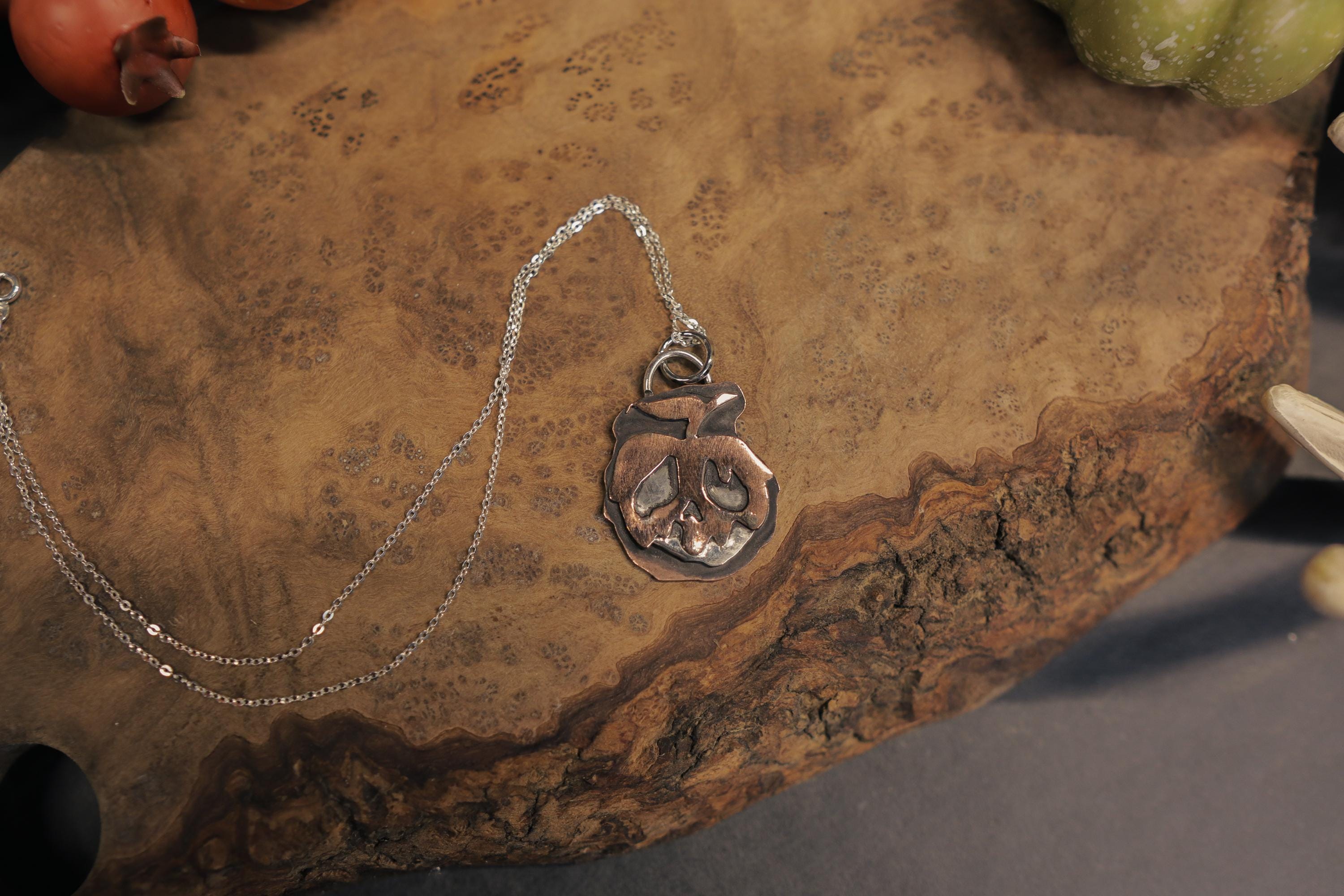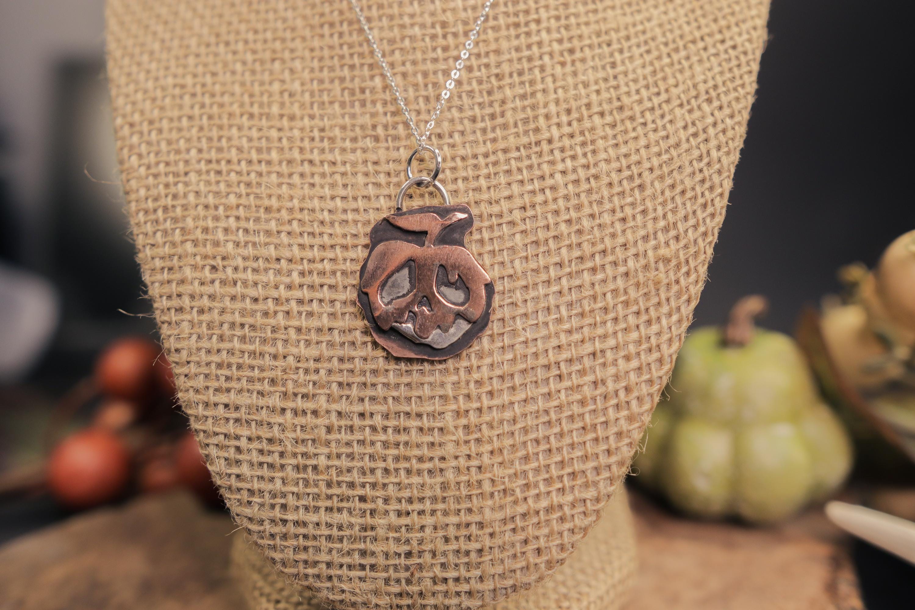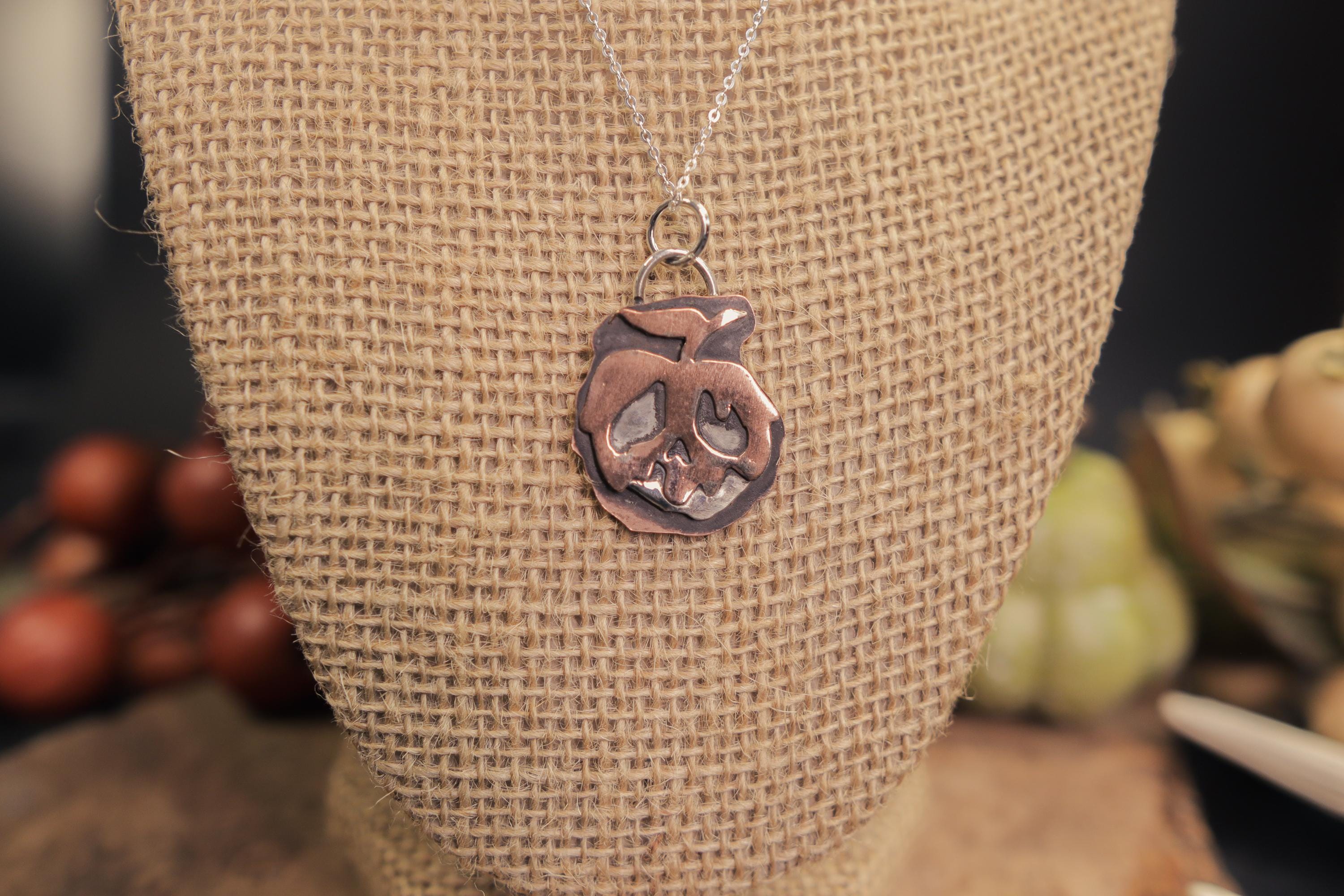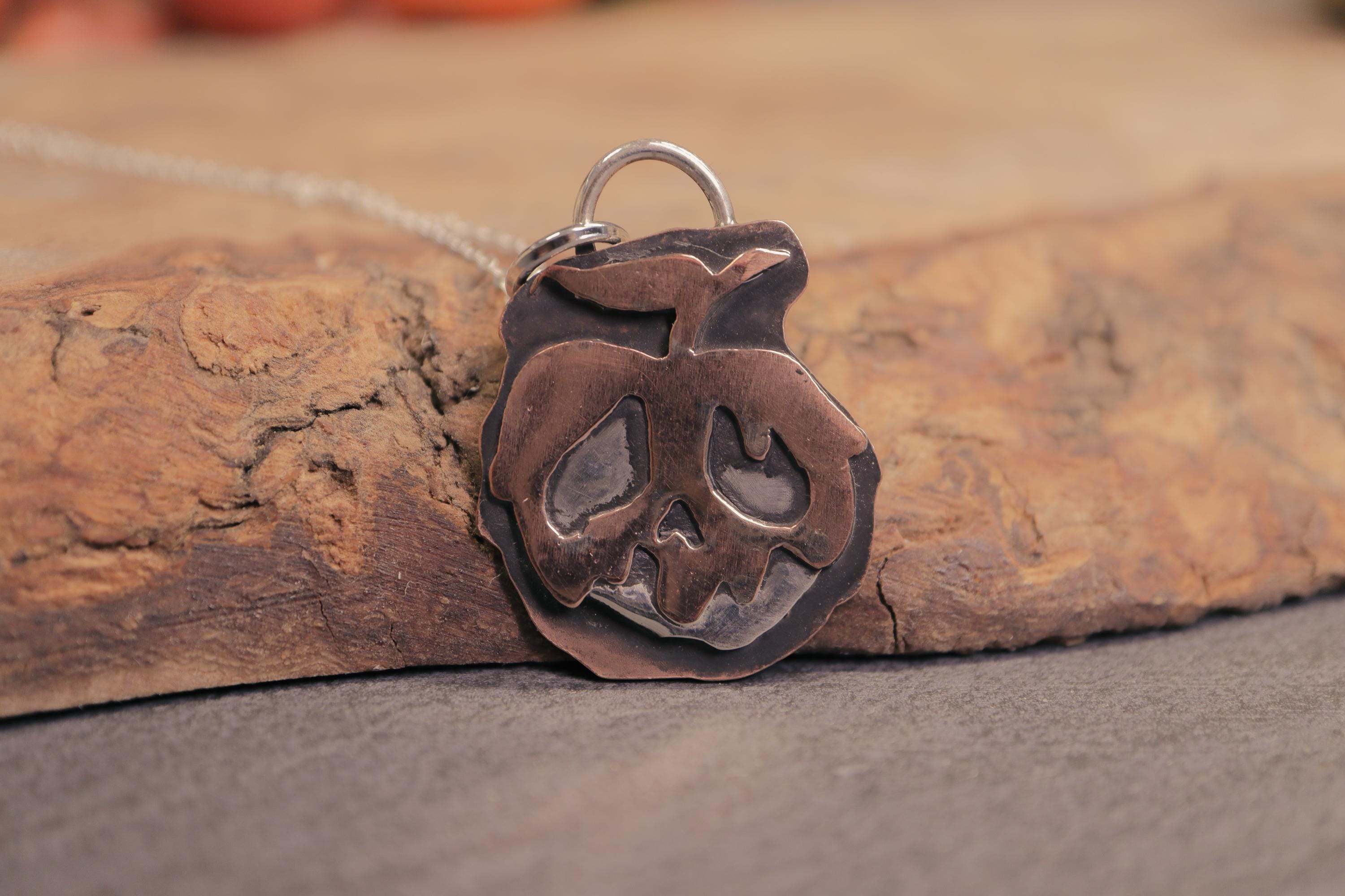 Celebrate the magic of Samhain with this enchanting Samhain Poison Apple Pendant, handcrafted from sterling silver and copper. The apple itself is sculpted in bright silver, while the dripping “poison” and backplate are made from warm, earthy copper—creating a striking mixed‑metal contrast inspired by classic witchy folklore.